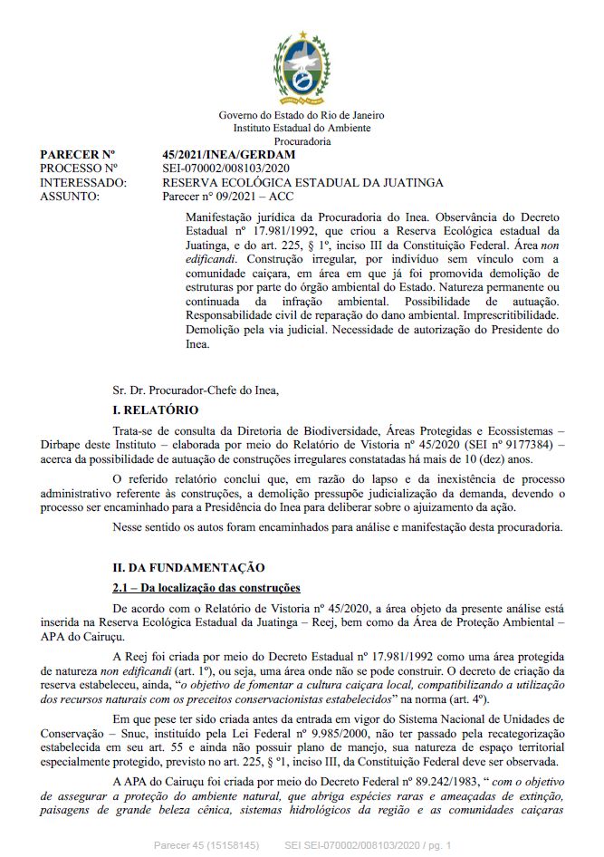 Manifestação jurídica da Procuradoria do Inea. Observância do Decreto Estadual nº 17.981/1992, que criou a Reserva Ecológica estadual da Juatinga, e do art. 225, § 1º, inciso III da Constituição Federal. Área non edificandi. Construção irregular, por indivíduo sem vínculo com a comunidade caiçara, em área em que já foi promovida demolição de estruturas por parte do órgão ambiental do Estado. Natureza permanente ou continuada da infração ambiental. Possibilidade de autuação. Responsabilidade civil de reparação do dano ambiental. Imprescritibilidade. Demolição pela via judicial. Necessidade de autorização do Presidente do Inea.