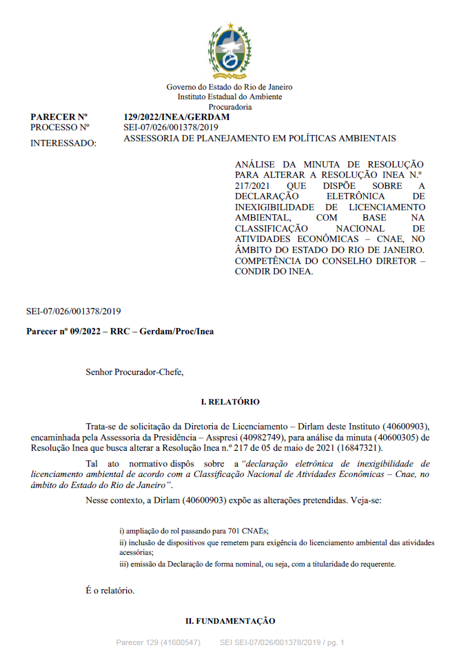 ANÁLISE DA MINUTA DE RESOLUÇÃO PARA ALTERAR A RESOLUÇÃO INEA N.º 217/2021 QUE DISPÕE SOBRE A DECLARAÇÃO ELETRÔNICA DE INEXIGIBILIDADE DE LICENCIAMENTO AMBIENTAL, COM BASE NA CLASSIFICAÇÃO NACIONAL DE ATIVIDADES ECONÔMICAS – CNAE, NO ÂMBITO DO ESTADO DO RIO DE JANEIRO. COMPETÊNCIA DO CONSELHO DIRETOR – CONDIR DO INEA.