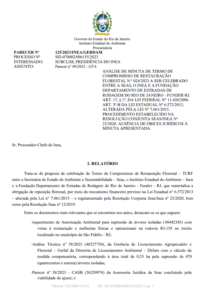 ANÁLISE DE MINUTA DE TERMO DE COMPROMISSO DE RESTAURAÇÃO FLORESTAL N.º 024/2023 A SER CELEBRADO ENTRE A SEAS, O INEA E A FUNDAÇÃO DEPARTAMENTO DE ESTRADAS DE RODAGEM DO RIO DE JANEIRO - FUNDER-RJ. ART. 17, § 1º, DA LEI FEDERAL N° 11.428/2006. ART. 3º-B DA LEI ESTADUAL Nº 6.572/2013, ALTERADA PELA LEI Nº 7.061/2015. PROCEDIMENTO ESTABELECIDO NA RESOLUÇÃO CONJUNTA SEAS/INEA N° 23/2020. AUSÊNCIA DE ÓBICES JURÍDICOS À MINUTA APRESENTADA.