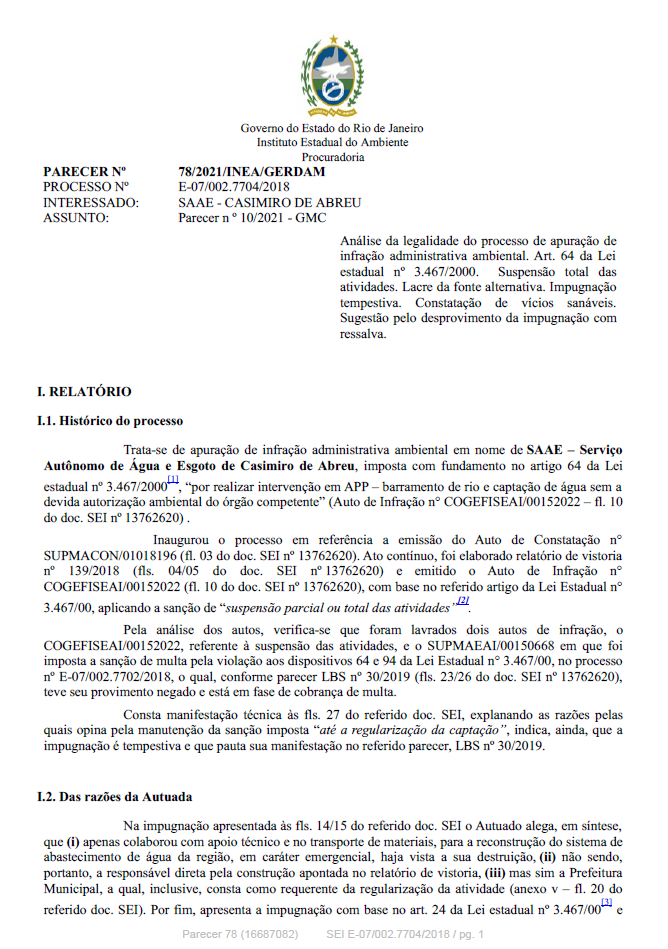 Análise da legalidade do processo de apuração de infração administrativa ambiental. Art. 64 da Lei estadual nº 3.467/2000. Suspensão total das atividades. Lacre da fonte alternativa. Impugnação tempestiva. Constatação de vícios sanáveis. Sugestão pelo desprovimento da impugnação com ressalva. I. RELATÓRIO