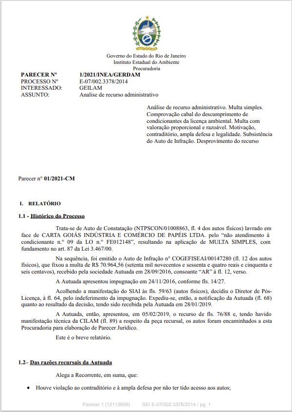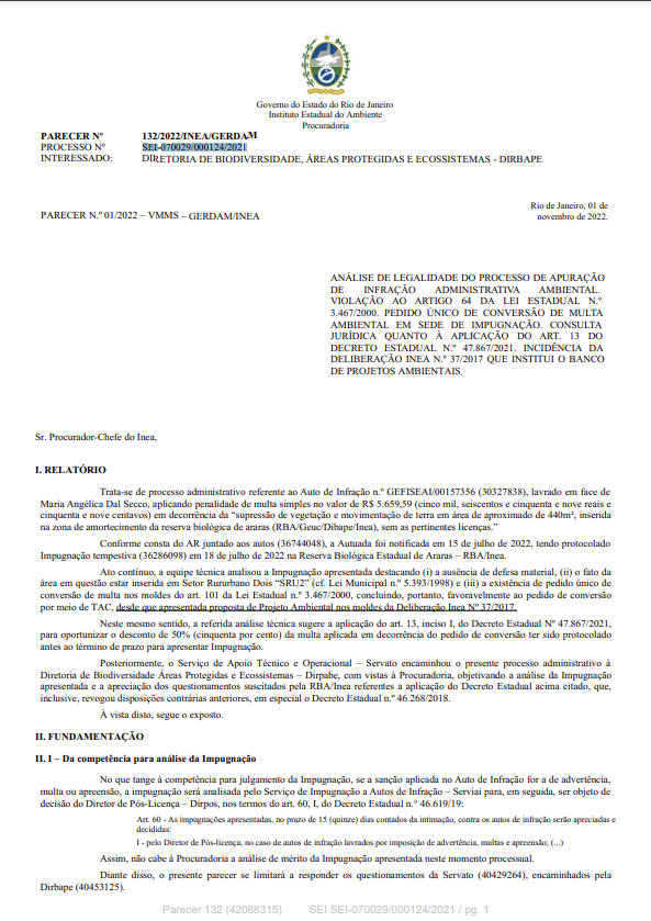ANÁLISE DE LEGALIDADE DO PROCESSO DE APURAÇÃO DE INFRAÇÃO ADMINISTRATIVA AMBIENTAL. VIOLAÇÃO AO ARTIGO 64 DA LEI ESTADUAL N.º 3.467/2000. PEDIDO ÚNICO DE CONVERSÃO DE MULTA AMBIENTAL EM SEDE DE IMPUGNAÇÃO. CONSULTA JURÍDICA QUANTO À APLICAÇÃO DO ART. 13 DO DECRETO ESTADUAL N.º 47.867/2021. INCIDÊNCIA DA DELIBERAÇÃO INEA N.º 37/2017 QUE INSTITUI O BANCO DE PROJETOS AMBIENTAIS