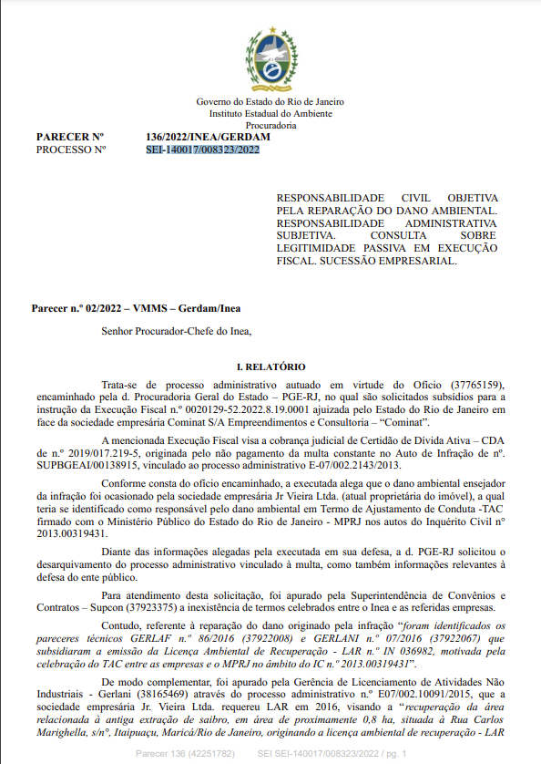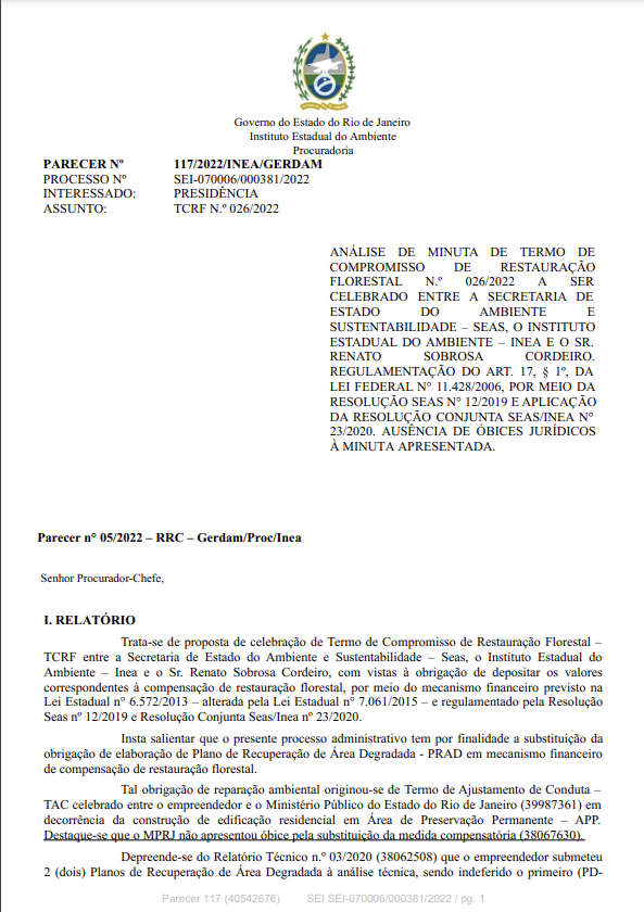 ANÁLISE DE MINUTA DE TERMO DE COMPROMISSO DE RESTAURAÇÃO FLORESTAL N.º 026/2022 A SER CELEBRADO ENTRE A SECRETARIA DE ESTADO DO AMBIENTE E SUSTENTABILIDADE – SEAS, O INSTITUTO ESTADUAL DO AMBIENTE – INEA E O SR. RENATO SOBROSA CORDEIRO. REGULAMENTAÇÃO DO ART. 17, § 1º, DA LEI FEDERAL N° 11.428/2006, POR MEIO DA RESOLUÇÃO SEAS N° 12/2019 E APLICAÇÃO DA RESOLUÇÃO CONJUNTA SEAS/INEA N° 23/2020. AUSÊNCIA DE ÓBICES JURÍDICOS À MINUTA APRESENTADA.