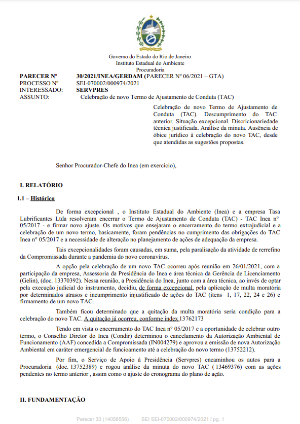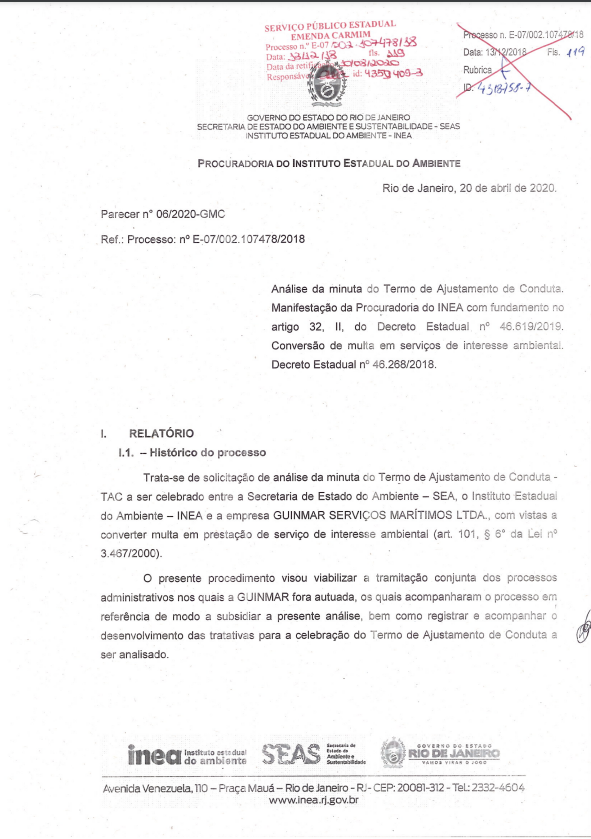 Análise da minuta do Termo de Ajustamento de Conduta. Manifestção da Procuradoria do INEA com fundamento no artigo 32, II, do Decreto Estadual n.º 46.619/2019. Conversão de multa em serviços de interesse ambiental. Decreto Estadual n.º 46.268/2018.