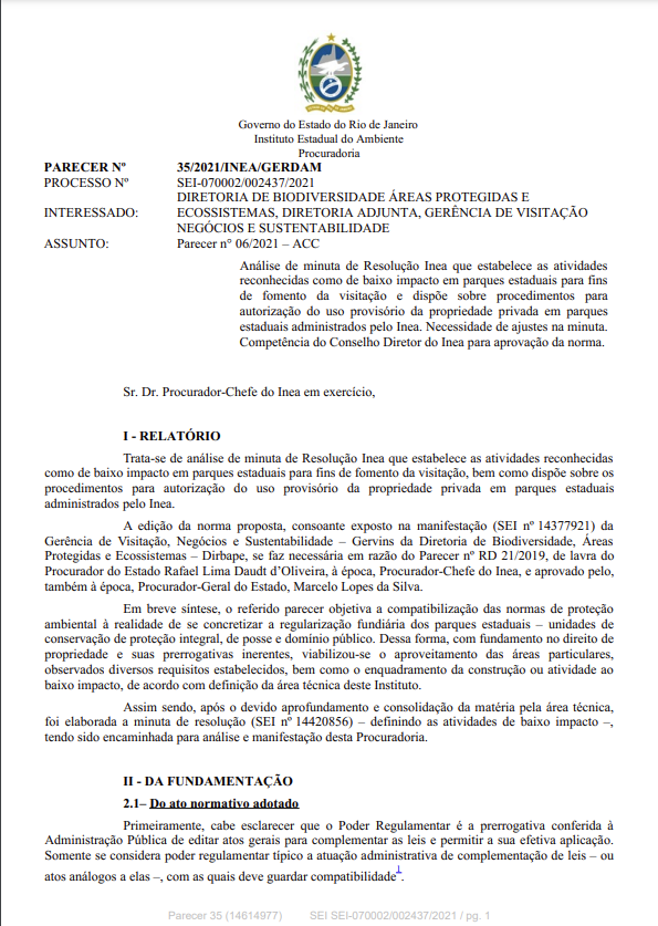 Análise de minuta de Resolução Inea que estabelece as atividades reconhecidas como de baixo impacto em parques estaduais para fins de fomento da visitação e dispõe sobre procedimentos para autorização do uso provisório da propriedade privada em parques estaduais administrados pelo Inea. Necessidade de ajustes na minuta. Competência do Conselho Diretor do Inea para aprovação da norma.