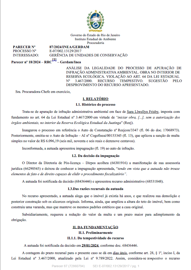 ANÁLISE DA LEGALIDADE DO PROCESSO DE APURAÇÃO DE INFRAÇÃO ADMINISTRATIVA AMBIENTAL. OBRA NO INTERIOR DE RESERVA ECOLÓGICA. VIOLAÇÃO AO ART. 64 DA LEI ESTADUAL Nº 3.467/2000. RECURSO TEMPESTIVO. SUGESTÃO PELO DESPROVIMENTO DO RECURSO APRESENTADO.