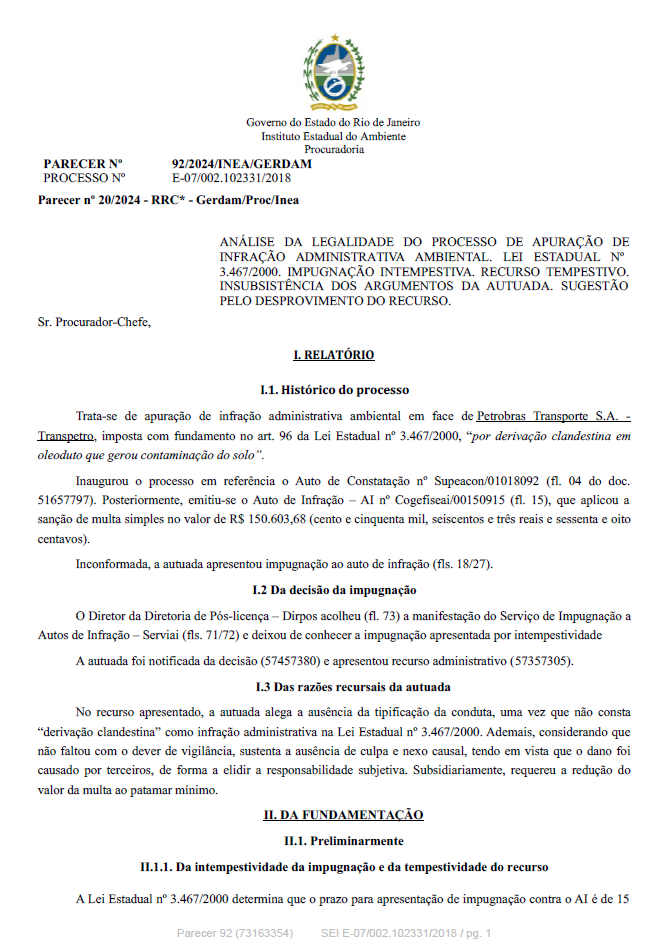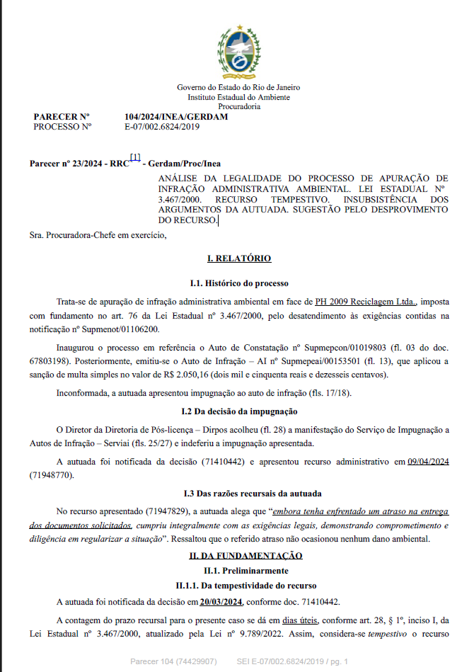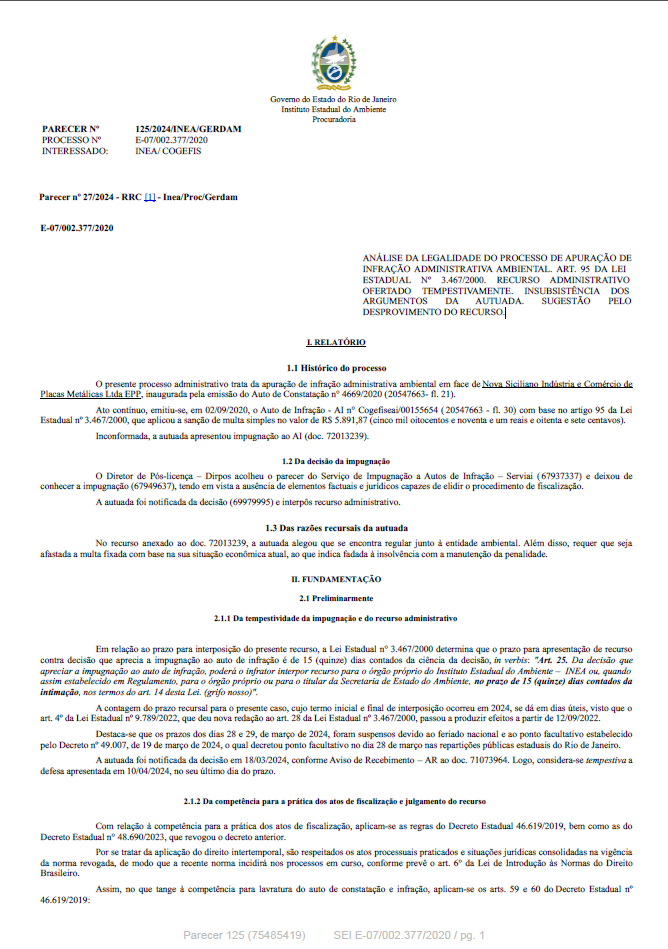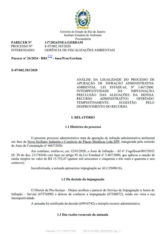 ANÁLISE DA LEGALIDADE DO PROCESSO DE APURAÇÃO DE INFRAÇÃO ADMINISTRATIVA AMBIENTAL. LEI ESTADUAL Nº 3.467/2000. INTEMPESTIVIDADE DA IMPUGNAÇÃO. PRECLUSÃO DAS ALEGAÇÕES DA DEFESA. RECURSO ADMINISTRATIVO OFERTADO TEMPESTIVAMENTE. SUGEST
