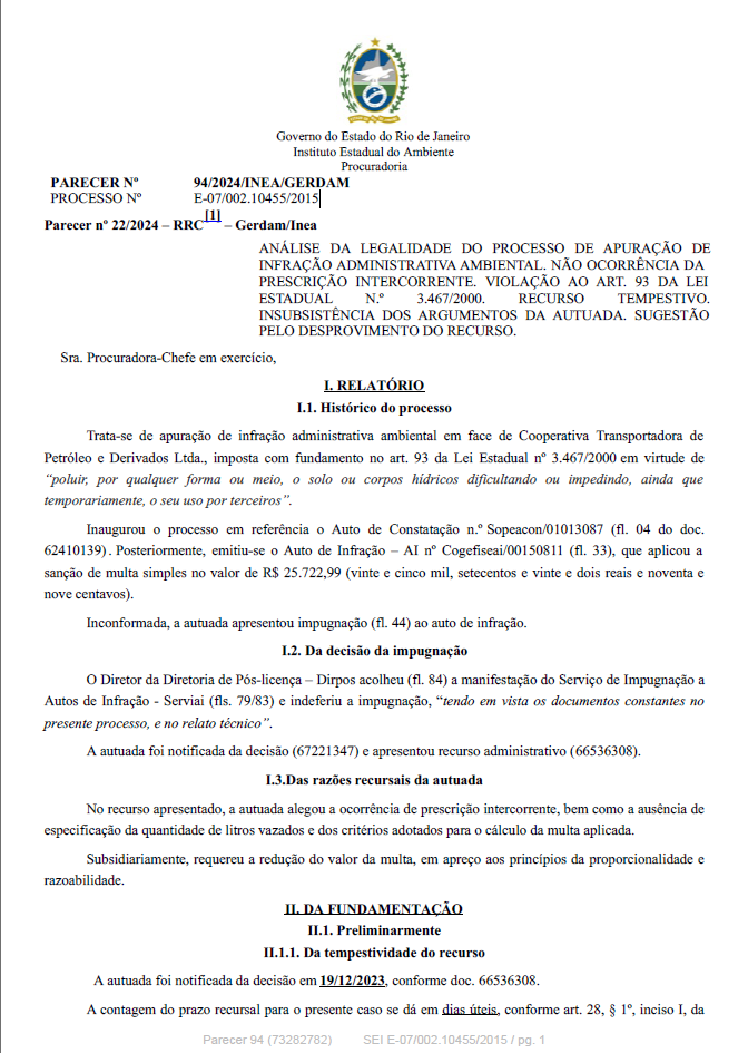 ANÁLISE DA LEGALIDADE DO PROCESSO DE APURAÇÃO DE INFRAÇÃO ADMINISTRATIVA AMBIENTAL. NÃO OCORRÊNCIA DA PRESCRIÇÃO INTERCORRENTE. VIOLAÇÃO AO ART. 93 DA LEI ESTADUAL N.º 3.467/2000. RECURSO TEMPESTIVO. INSUBSISTÊNCIA DOS ARGUMENTOS DA AUTUADA. SUGESTÃO PELO DESPROVIMENTO DO RECURSO.