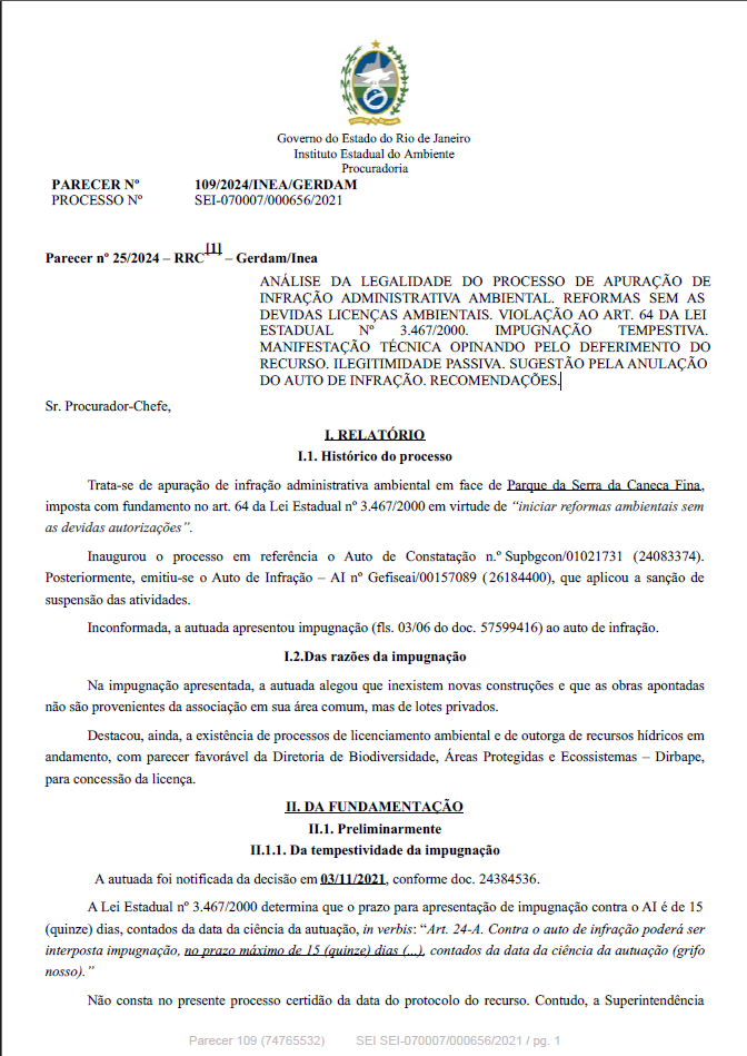 ANÁLISE DA LEGALIDADE DO PROCESSO DE APURAÇÃO DE INFRAÇÃO ADMINISTRATIVA AMBIENTAL. REFORMAS SEM AS DEVIDAS LICENÇAS AMBIENTAIS. VIOLAÇÃO AO ART. 64 DA LEI ESTADUAL Nº 3.467/2000. IMPUGNAÇÃO TEMPESTIVA. MANIFESTAÇÃO TÉCNICA OPINANDO PELO DEFERIMENTO DO RECURSO. ILEGITIMIDADE PASSIVA. SUGESTÃO PELA ANULAÇÃO DO AUTO DE INFRAÇÃO. RECOMENDAÇÕES.