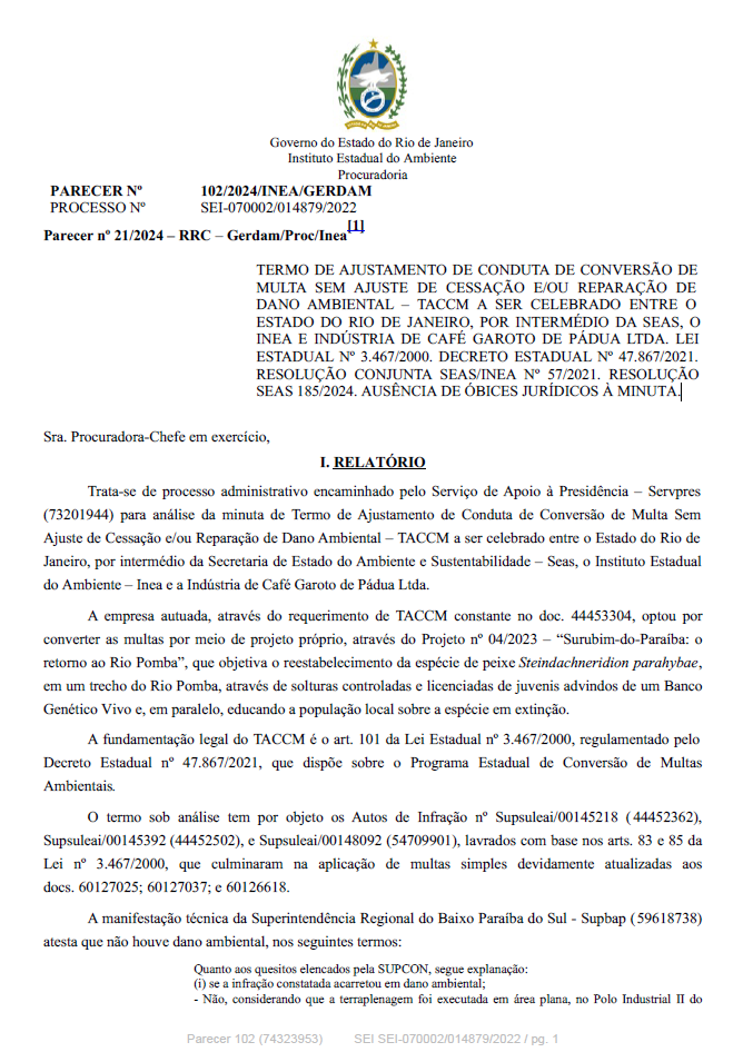 TERMO DE AJUSTAMENTO DE CONDUTA DE CONVERSÃO DE MULTA SEM AJUSTE DE CESSAÇÃO E/OU REPARAÇÃO DE DANO AMBIENTAL – TACCM A SER CELEBRADO ENTRE O ESTADO DO RIO DE JANEIRO, POR INTERMÉDIO DA SEAS, O INEA E INDÚSTRIA DE CAFÉ GAROTO DE PÁDUA LTDA. LEI ESTADUAL Nº 3.467/2000. DECRETO ESTADUAL Nº 47.867/2021. RESOLUÇÃO CONJUNTA SEAS/INEA Nº 57/2021. RESOLUÇÃO SEAS 185/2024. AUSÊNCIA DE ÓBICES JURÍDICOS À MINUTA.