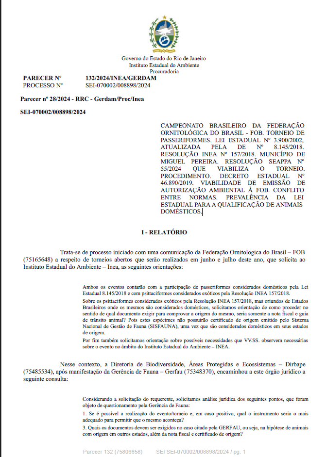 CAMPEONATO BRASILEIRO DA FEDERAÇÃO ORNITOLÓGICA DO BRASIL - FOB. TORNEIO DE PASSERIFORMES. LEI ESTADUAL Nº 3.900/2002, ATUALIZADA PELA DE Nº 8.145/2018. RESOLUÇÃO INEA Nº 157/2018. MUNICÍPIO DE MIGUEL PEREIRA. RESOLUÇÃO SEAPPA Nº 55/2024 QUE VIABILIZA O TORNEIO. PROCEDIMENTO. DECRETO ESTADUAL Nº 46.890/2019. VIABILIDADE DE EMISSÃO DE AUTORIZAÇÃO AMBIENTAL À FOB. CONFLITO ENTRE NORMAS. PREVALÊNCIA DA LEI ESTADUAL PARA A QUALIFICAÇÃO DE ANIMAIS DOMÉSTICOS.