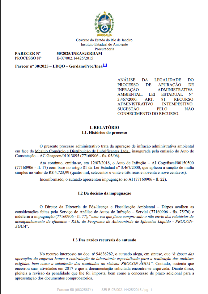 ANÁLISE DA LEGALIDADE DO PROCESSO DE APURAÇÃO DE INFRAÇÃO ADMINISTRATIVA AMBIENTAL. LEI ESTADUAL Nº 3.467/2000. ART. 81. RECURSO ADMINISTRATIVO INTEMPESTIVO. SUGESTÃO PELO NÃO CONHECIMENTO DO RECURSO.
