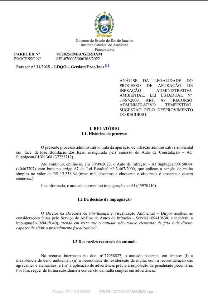 ANÁLISE DA LEGALIDADE DO PROCESSO DE APURAÇÃO DE INFRAÇÃO ADMINISTRATIVA AMBIENTAL. LEI ESTADUAL Nº 3.467/2000. ART. 87. RECURSO ADMINISTRATIVO TEMPESTIVO. SUGESTÃO PELO DESPROVIMENTO DO RECURSO.
