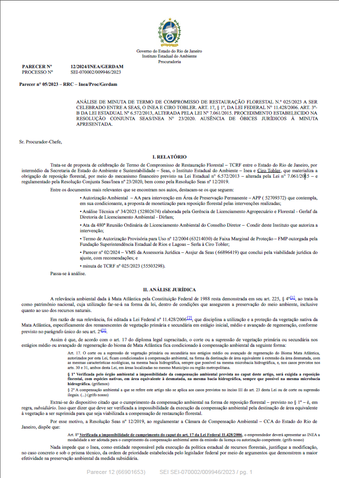 ANÁLISE DE MINUTA DE TERMO DE COMPROMISSO DE RESTAURAÇÃO FLORESTAL N.º 025/2023 A SER CELEBRADO ENTRE A SEAS, O INEA E CIRO TOBLER. ART. 17, § 1º, DA LEI FEDERAL N° 11.428/2006. ART. 3º- B DA LEI ESTADUAL Nº 6.572/2013, ALTERADA PELA LEI Nº 7.061/2015. PROCEDIMENTO ESTABELECIDO NA RESOLUÇÃO CONJUNTA SEAS/INEA N° 23/2020. AUSÊNCIA DE ÓBICES JURÍDICOS À MINUTA APRESENTADA.