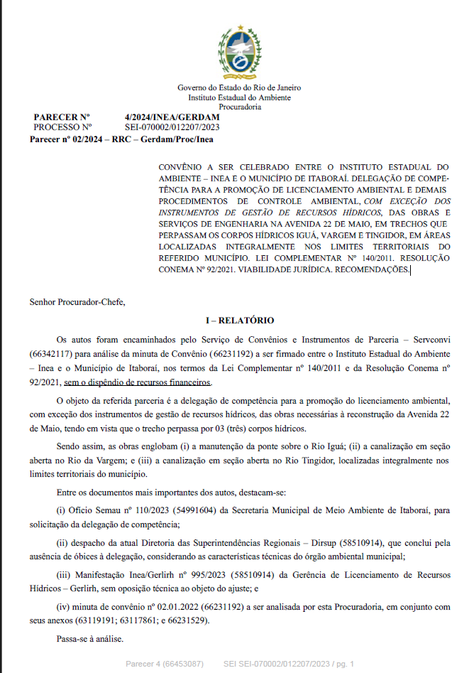 CONVÊNIO A SER CELEBRADO ENTRE O INSTITUTO ESTADUAL DO AMBIENTE – INEA E O MUNICÍPIO DE ITABORAÍ. DELEGAÇÃO DE COMPETÊNCIA PARA A PROMOÇÃO DE LICENCIAMENTO AMBIENTAL E DEMAIS PROCEDIMENTOS DE CONTROLE AMBIENTAL, COM EXCEÇÃO DOS INSTRUMENTOS DE GESTÃO DE RECURSOS HÍDRICOS, DAS OBRAS E SERVIÇOS DE ENGENHARIA NA AVENIDA 22 DE MAIO, EM TRECHOS QUE PERPASSAM OS CORPOS HÍDRICOS IGUÁ, VARGEM E TINGIDOR, EM ÁREAS LOCALIZADAS INTEGRALMENTE NOS LIMITES TERRITORIAIS DO REFERIDO MUNICÍPIO. LEI COMPLEMENTAR Nº 140/2011. RESOLUÇÃO CONEMA Nº 92/2021. VIABILIDADE JURÍDICA. RECOMENDAÇÕES.