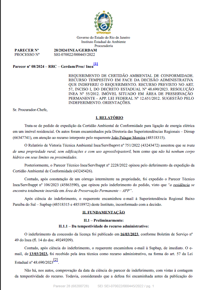 REQUERIMENTO DE CERTIDÃO AMBIENTAL DE CONFORMIDADE. RECURSO TEMPESTIVO EM FACE DA DECISÃO ADMINISTRATIVA QUE INDEFERIU O REQUERIMENTO. RECURSO PREVISTO NO ART. 57, INCISO I, DO DECRETO ESTADUAL Nº 48.690/2023. RESOLUÇÃO INEA Nº 55/2012. IMÓVEL SITUADO EM ÁREA DE PRESERVAÇÃO PERMANENTE - APP. LEI FEDERAL Nº 12.651/2012. SUGESTÃO PELO INDEFERIMENTO. ORIENTAÇÕES.