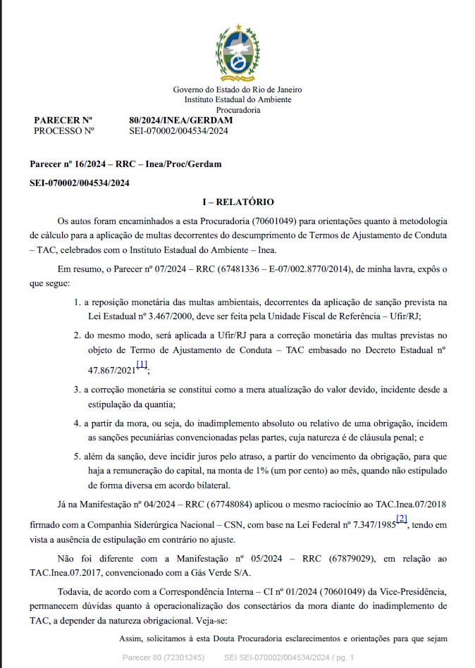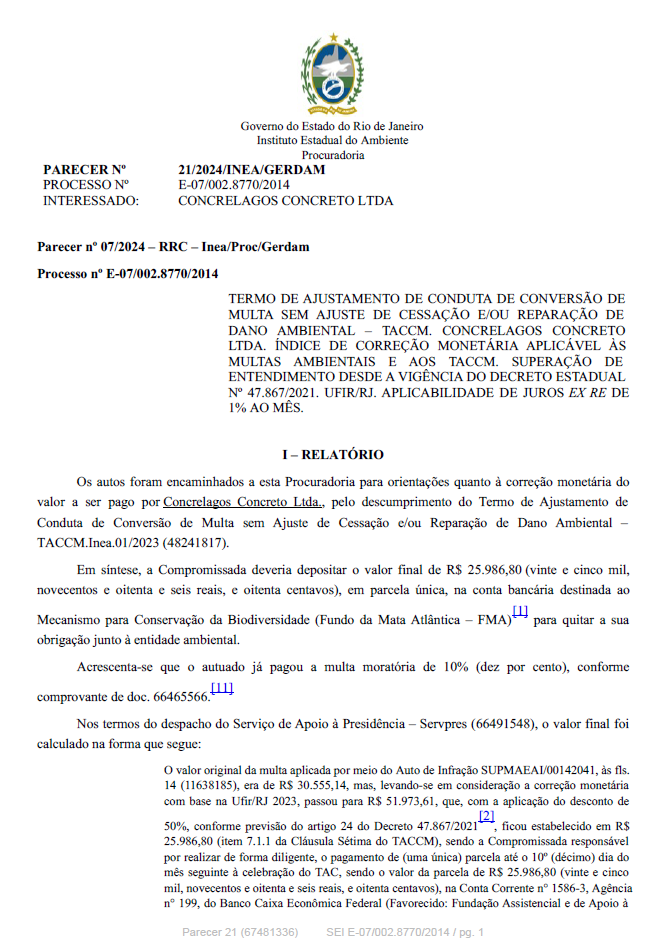 TERMO DE AJUSTAMENTO DE CONDUTA DE CONVERSÃO DE MULTA SEM AJUSTE DE CESSAÇÃO E/OU REPARAÇÃO DE DANO AMBIENTAL – TACCM. CONCRELAGOS CONCRETO LTDA. ÍNDICE DE CORREÇÃO MONETÁRIA APLICÁVEL ÀS MULTAS AMBIENTAIS E AOS TACCM. SUPERAÇÃO DE ENTENDIMENTO DESDE A VIGÊNCIA DO DECRETO ESTADUAL Nº 47.867/2021. UFIR/RJ. APLICABILIDADE DE JUROS EX RE DE 1% AO MÊS.