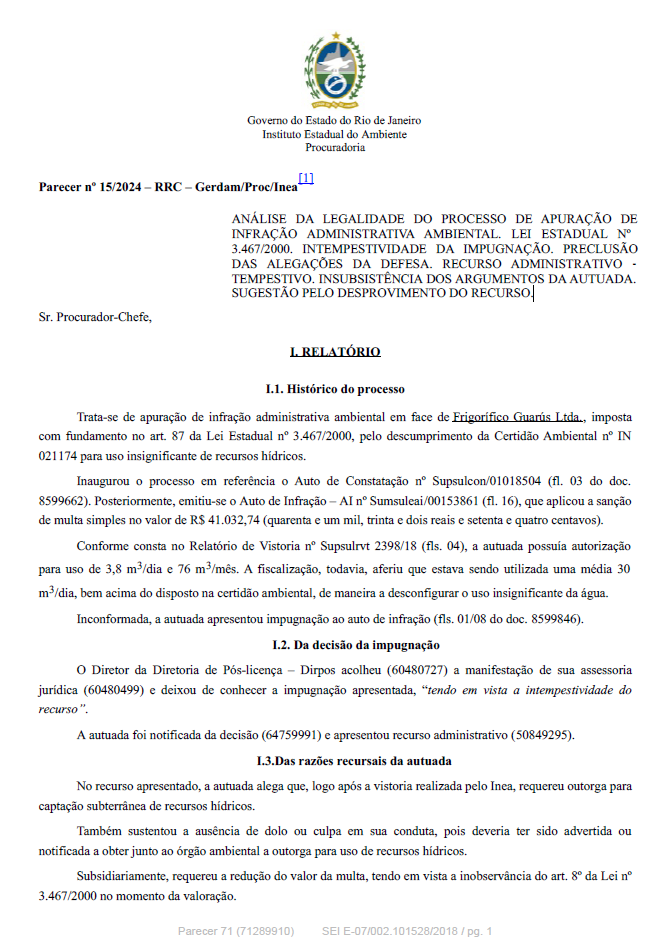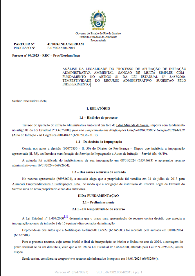 ANÁLISE DA LEGALIDADE DO PROCESSO DE APURAÇÃO DE INFRAÇÃO ADMINISTRATIVA AMBIENTAL. SANÇÃO DE MULTA SIMPLES COM FUNDAMENTO NO ARTIGO 81 DA LEI ESTADUAL Nº 3.467/2000. TEMPESTIVIDADE DO RECURSO ADMINISTRATIVO. SUGESTÃO PELO INDEFERIMENTO.