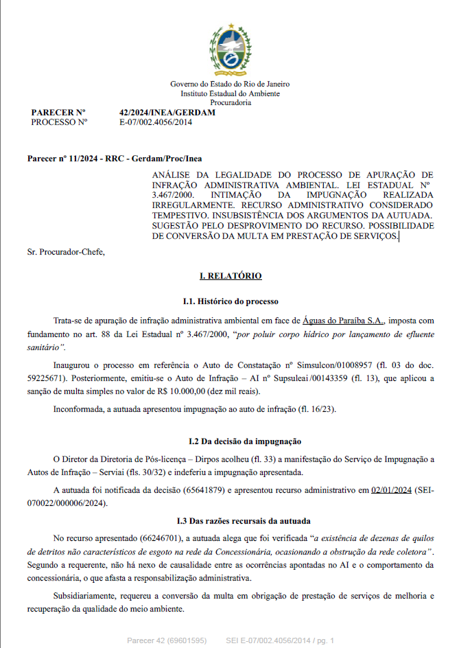 ANÁLISE DA LEGALIDADE DO PROCESSO DE APURAÇÃO DE INFRAÇÃO ADMINISTRATIVA AMBIENTAL. LEI ESTADUAL Nº 3.467/2000. INTIMAÇÃO DA IMPUGNAÇÃO REALIZADA IRREGULARMENTE. RECURSO ADMINISTRATIVO CONSIDERADO TEMPESTIVO. INSUBSISTÊNCIA DOS ARGUMENTOS DA AUTUADA. SUGESTÃO PELO DESPROVIMENTO DO RECURSO. POSSIBILIDADE DE CON VERSÃO DA MULTA EM PRESTAÇÃO DE SERVIÇOS.