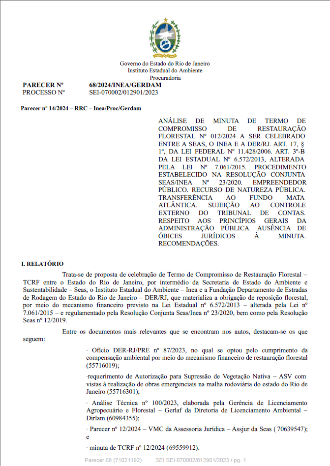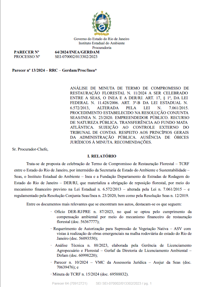 ANÁLISE DE MINUTA DE TERMO DE COMPROMISSO DE RESTAURAÇÃO FLORESTAL N. 11/2024 A SER CELEBRADO ENTRE A SEAS, O INEA E A DER/RJ. ART. 17, § 1º, DA LEI FEDERAL N. 11.428/2006. ART. 3º-B DA LEI ESTADUAL N. 6.572/2013, ALTERADA PELA LEI N. 7.061/2015. PROCEDIMENTO ESTABELECIDO NA RESOLUÇÃO CONJUNTA SEAS/INEA N. 23/2020. EMPREENDEDOR PÚBLICO. RECURSO DE NATUREZA PÚBLICA. TRANSFERÊNCIA AO FUNDO MATA ATLÂNTICA. SUJEIÇÃO AO CONTROLE EXTERNO DO TRIBUNAL DE CONTAS. RESPEITO AOS PRINCÍPIOS GERAIS DA ADMINISTRAÇÃO PÚBLICA. AUSÊNCIA DE ÓBICES JURÍDICOS À MINUTA. RECOMENDAÇÕES.