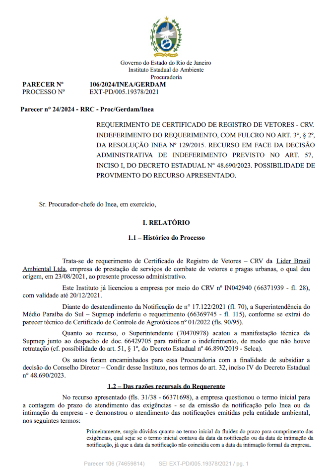 REQUERIMENTO DE CERTIFICADO DE REGISTRO DE VETORES - CRV. INDEFERIMENTO DO REQUERIMENTO, COM FULCRO NO ART. 3°, § 2º, DA RESOLUÇÃO INEA Nº 129/2015. RECURSO EM FACE DA DECISÃO ADMINISTRATIVA DE INDEFERIMENTO PREVISTO NO ART. 57, INCISO I, DO DECRETO ESTADUAL N° 48.690/2023. POSSIBILIDADE DE PROVIMENTO DO RECURSO APRESENTADO.