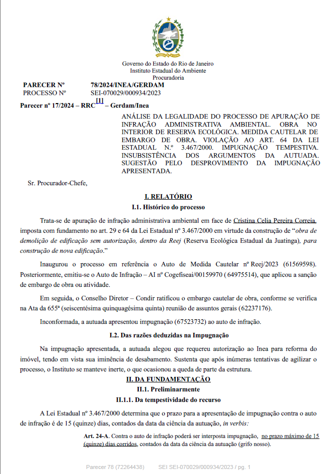 ANÁLISE DA LEGALIDADE DO PROCESSO DE APURAÇÃO DE INFRAÇÃO ADMINISTRATIVA AMBIENTAL. OBRA NO INTERIOR DE RESERVA ECOLÓGICA. MEDIDA CAUTELAR DE EMBARGO DE OBRA. VIOLAÇÃO AO ART. 64 DA LEI ESTADUAL N.º 3.467/2000. IMPUGNAÇÃO TEMPESTIVA. INSUBSISTÊNCIA DOS ARGUMENTOS DA AUTUADA. SUGESTÃO PELO DESPROVIMENTO DA IMPUGNAÇÃO APRESENTADA.