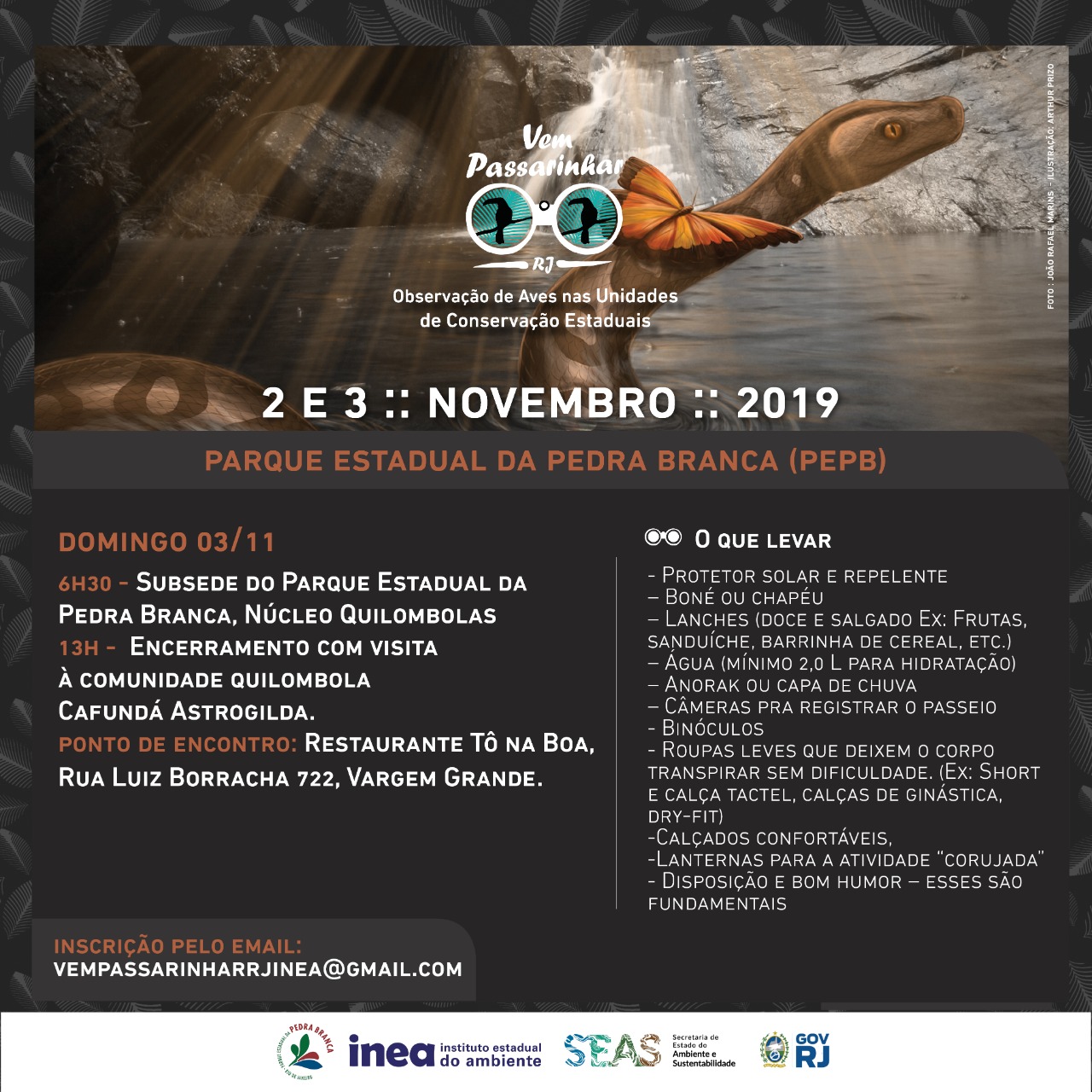 No domingo (3/11), a observação de aves acontecerá na trilha do terreiro de pedra, no núcleo quilombola do parque. A atividade inclui uma visita à comunidade quilombola Cafundá Astrogilda, em Vargem Grande. Para participar, é necessária a inscrição por e-mail: vempassarinharrjinea@gmail.com.