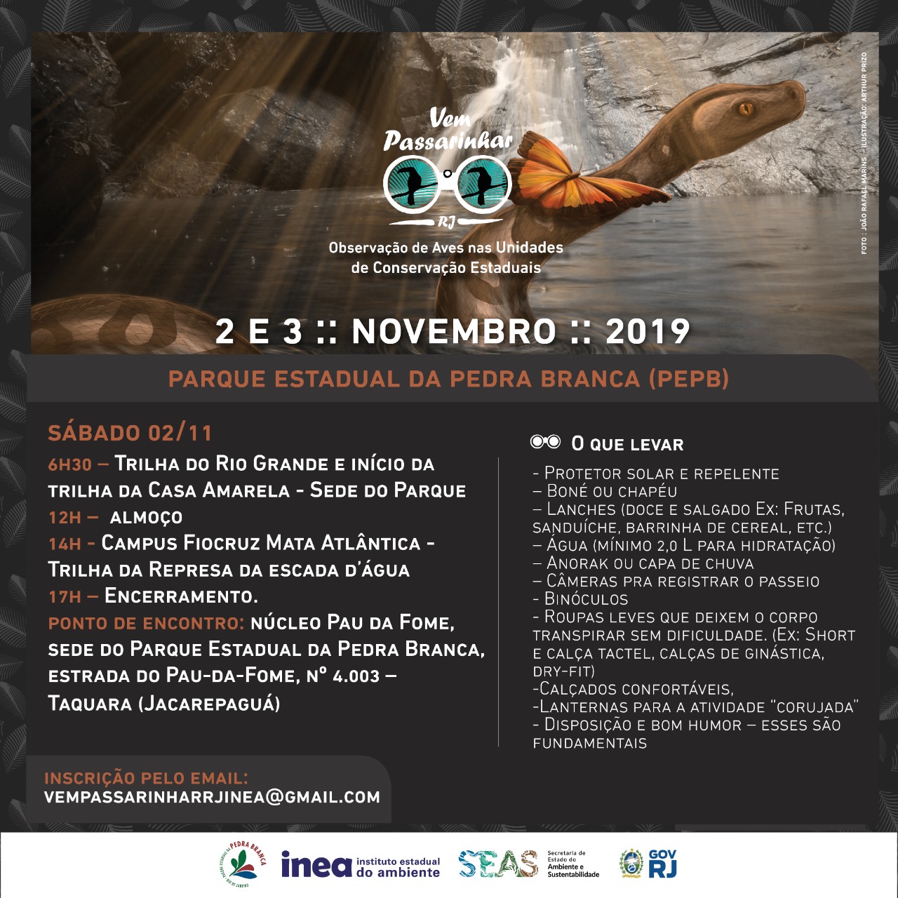 O Parque Estadual da Pedra Branca, na zona oeste do Rio, promove neste fim de semana (2 e 3/11) o Programa Vem Passarinhar RJ. Idealizado pelo Instituto Estadual do Ambiente (Inea), órgão vinculado à Secretaria de Estado do Ambiente e Sustentabilidade, esse programa tem como objetivo inspirar e unir pessoas interessadas em proteger e desfrutar da observação de aves em unidades de conservação estaduais.