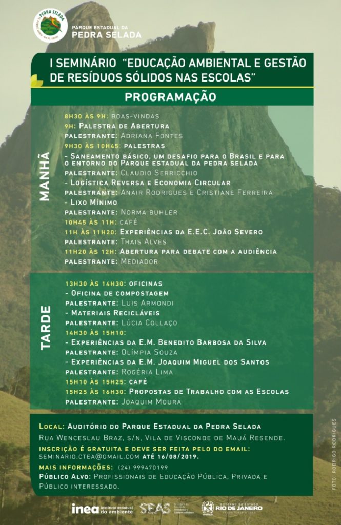 O Instituto Estadual do Ambiente (inea), por meio do Parque Estadual da Pedra Selada (PEPS), realiza no próximo dia 27 de agosto o I Seminário “Educação Ambiental e Gestão de Resíduos nas escolas”, no auditório da sede da unidade de conservação, em Visconde de Mauá/Resende. A atividade tem o objetivo de promover a reflexão sobre estratégias de abordagem dos temas nas escolas do entorno do parque.