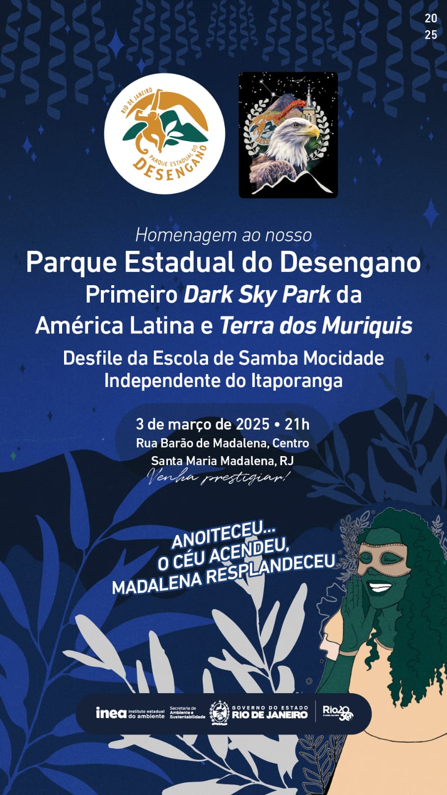 Primeiro Dark Sky Park da América Latina, o Parque Estadual do Desengano, unidade de conservação administrada pelo Instituto Estadual do Ambiente (Inea) e situada no Norte Fluminense, será homenageado por uma tradicional escola de samba de Santa Maria Madalena, na terça-feira de Carnaval (3/3). O desfile terá início às 21h, na Rua Barão Madalena, no Centro desse município.
