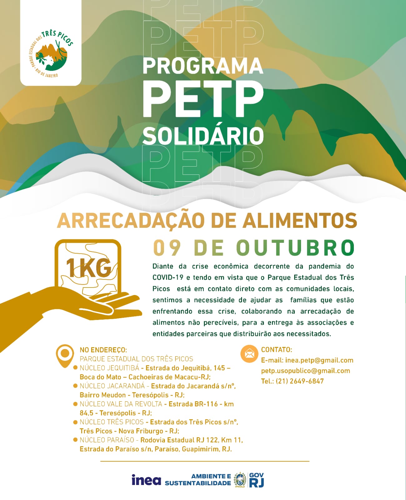 Diante da crise econômica decorrente da pandemia da Covid-19, o Parque Estadual dos Três Picos (PEPT) arrecadará, no próximo dia 9 de outubro, alimentos para serem doados às comunidades próximas à unidade de conservação administrada pelo Instituto Estadual do Ambiente (Inea). A ação faz parte do projeto “PEPT Solidário” e beneficiará diversas famílias em situação de vulnerabilidade econômica.