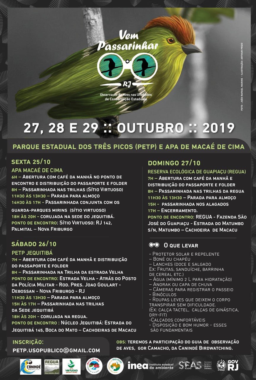 O Instituto Estadual do Ambiente (Inea), órgão vinculado à Secretaria de Estado do Ambiente e Sustentabilidade (Seas), promove, de sexta a domingo (25 a 27/10), o programa Vem Passarinhar RJ em duas unidades de conservação (UCs) na região serrana do estado. Desta vez, as atividades de observação de aves em vida livre ocorrerão no Parque Estadual dos Três Picos (PETP) e na Área de Proteção Ambiental Macaé de Cima.