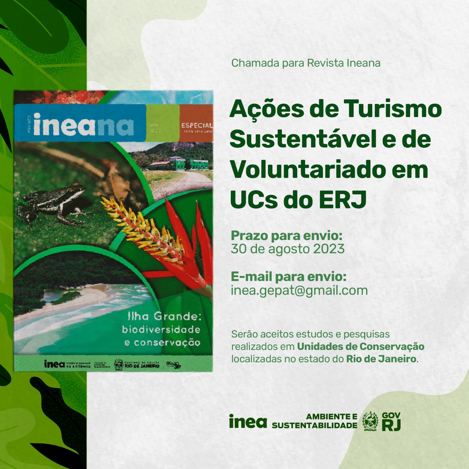 Até o dia 30/8, a Revista Ineana receberá artigos com os temas turismo sustentável e voluntariado em unidades de conservação estaduais para a nova edição do periódico. Os estudos devem seguir a política editorial e as normas de publicação da revista, e serem enviados para o e-mail inea.gepat@gmail.com.