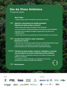 O projeto Conexão Mata Atlântica, promovido pelo Instituto Estadual do Ambiente (Inea), órgão vinculado à Secretaria de Estado do Ambiente e Sustentabilidade (Seas), e a pela Secretaria de Agricultura, Pecuária, Abastecimento e Pesca (Seappa), realiza no dia 27 de maio, às 14h, no Museu do Amanhã, evento de comemoração do Dia Nacional da Mata Atlântica.