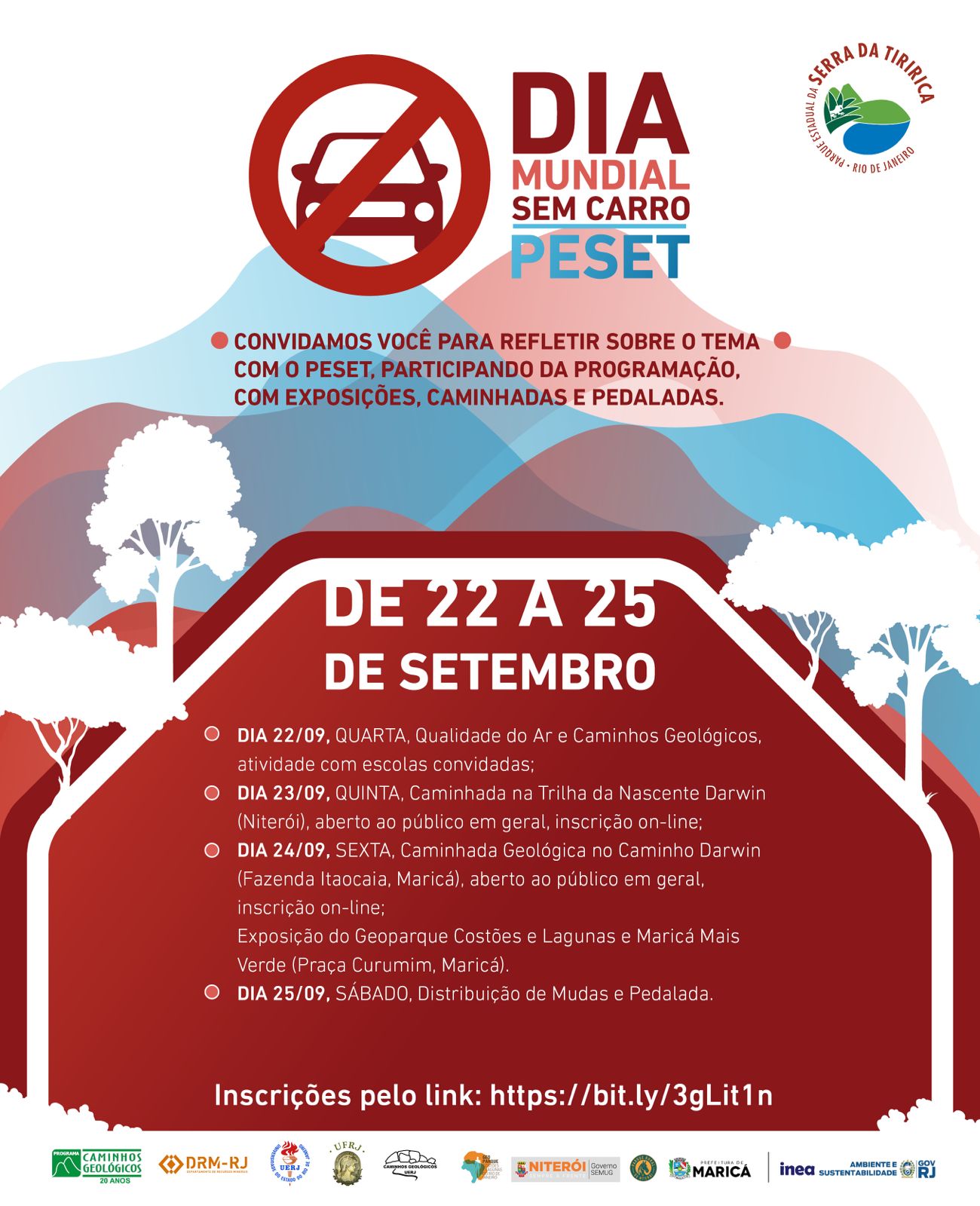 A Secretaria de Estado do Ambiente e Sustentabilidade (Seas) e o Instituto Estadual do Ambiente (Inea) promoverão, por meio das unidades de conservação, o Dia Mundial Sem Carro. A data comemorada no dia 22 de setembro, surgiu na França no ano de 1997, é comemorada no Brasil desde 2001 e visa conscientizar a população mundial a respeito dos malefícios dos automóveis.