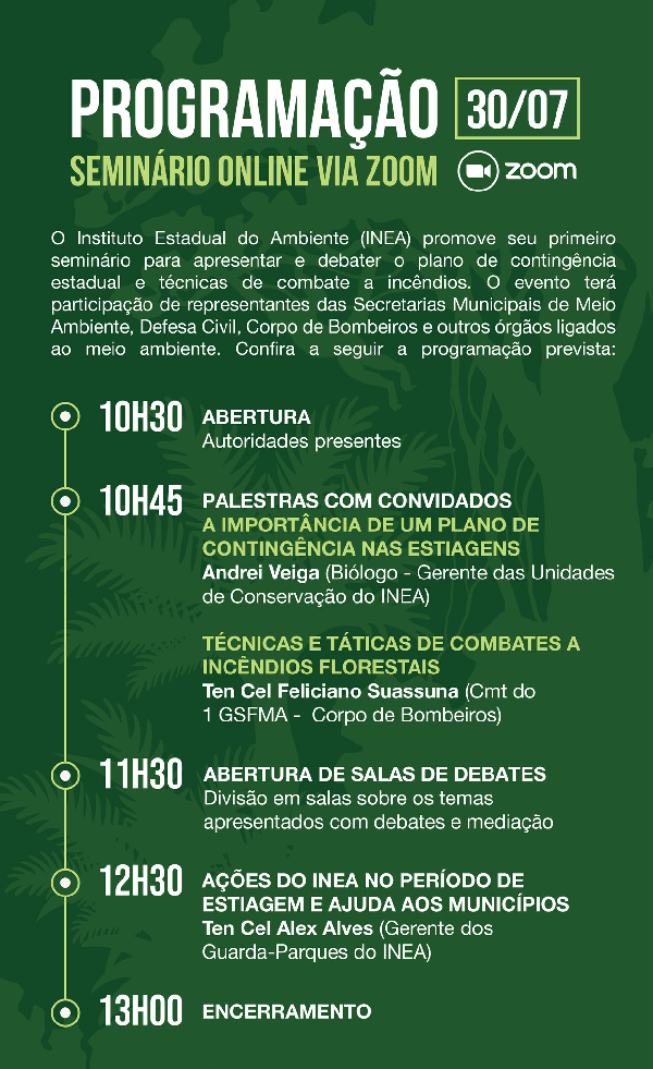 Na próxima sexta-feira (30/07) acontece o primeiro Seminário Estadual de Contingência para Estiagens e Incêndios Florestais. O evento será transmitido diretamente da sede do Inea e acontecerá totalmente à distância, aumentando a possibilidade de participação de um número maior de pessoas e mantendo o distanciamento social exigido por conta da pandemia de Covid-19.
