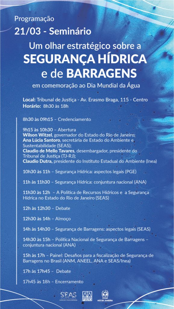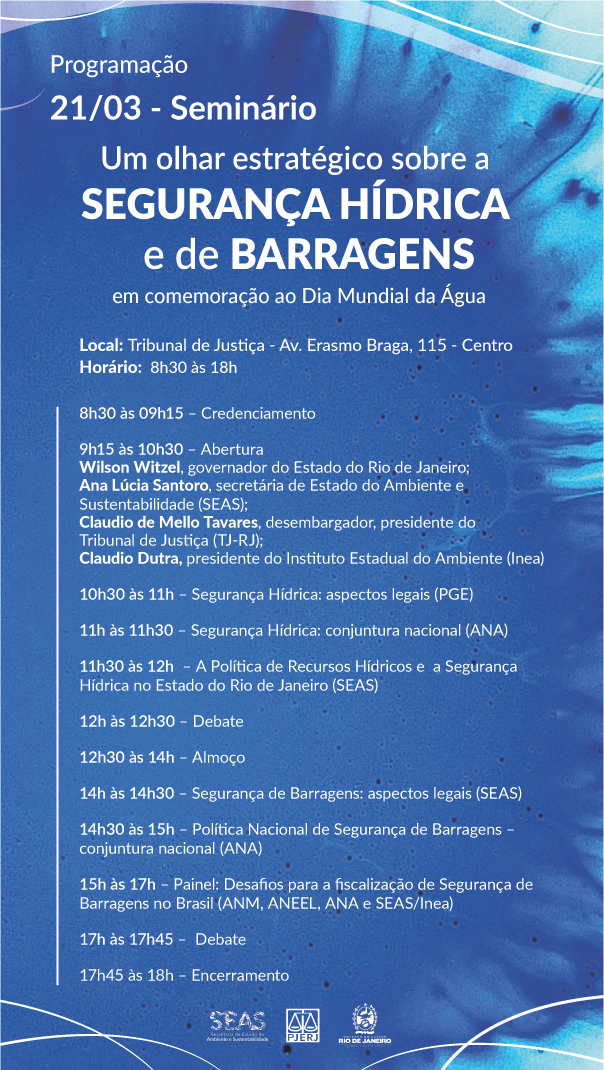 A mesa de abertura do seminário contará com a presença do governador Wilson Witzel, da secretária de Estado do Ambiente e Sustentabilidade, Ana Lúcia Santoro, do desembargados e presidente do Tribunal de Justiça do Rio de Janeiro (TJ-RJ), Claudio de Mello Tavares, e o presidente do Inea, Claudio Dutra. O evento acontece no auditório do TJ-RJ, das 8h30 às 18h, e promoverá debates entre instituições do Governo Estadual além de representantes do Supremo Tribunal Federal (STF), da Agência Nacional das Águas (ANA), do Instituto Estadual do Ambiente (Inea), órgão ambiental vinculado à Seas, entre outros.