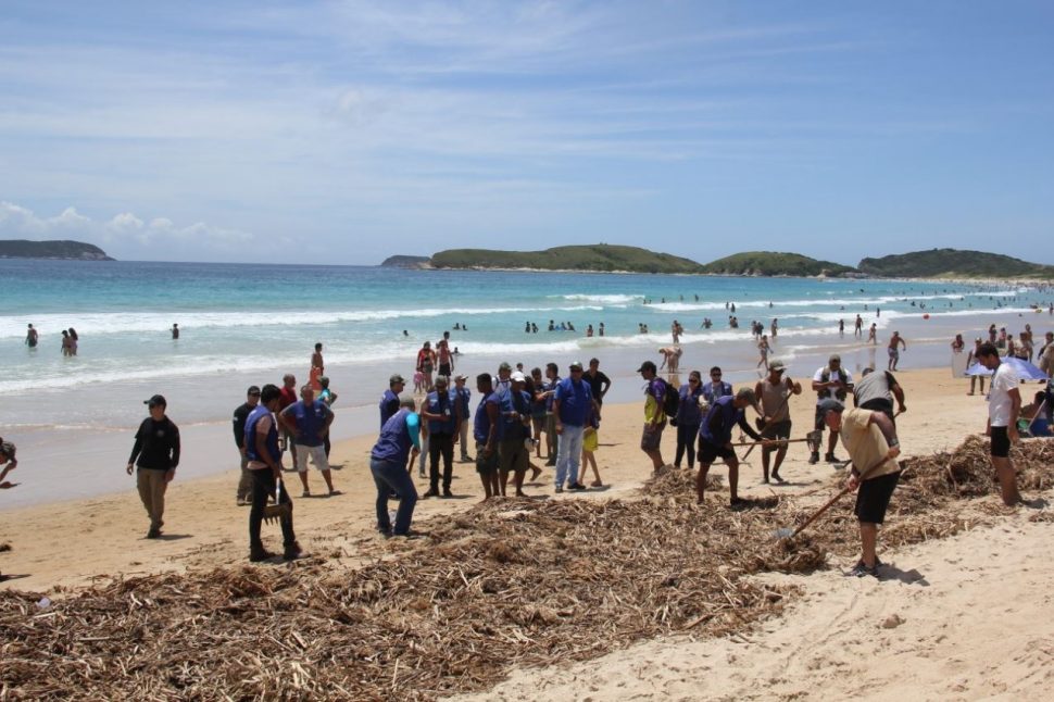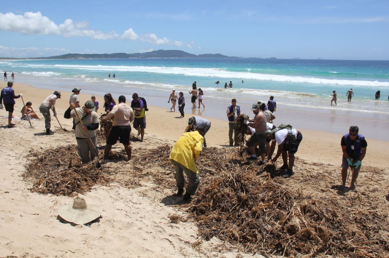 Na madrugada, técnicos e guarda-parques dos órgãos ambientais estaduais utilizaram maquinário pesado para a retirada de plantas aquáticas acumuladas nas areias das praias do Peró e das Conchas, ação esta que vai se estender às praias Rasa e de Tamoios na madrugada de hoje para amanhã.