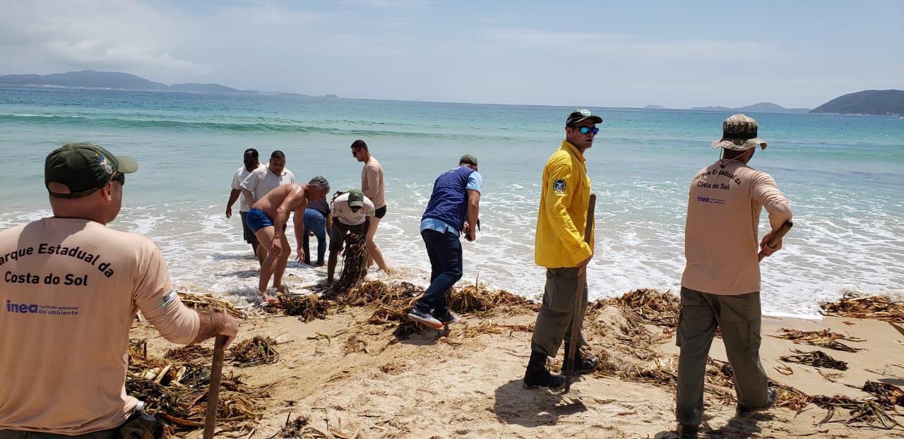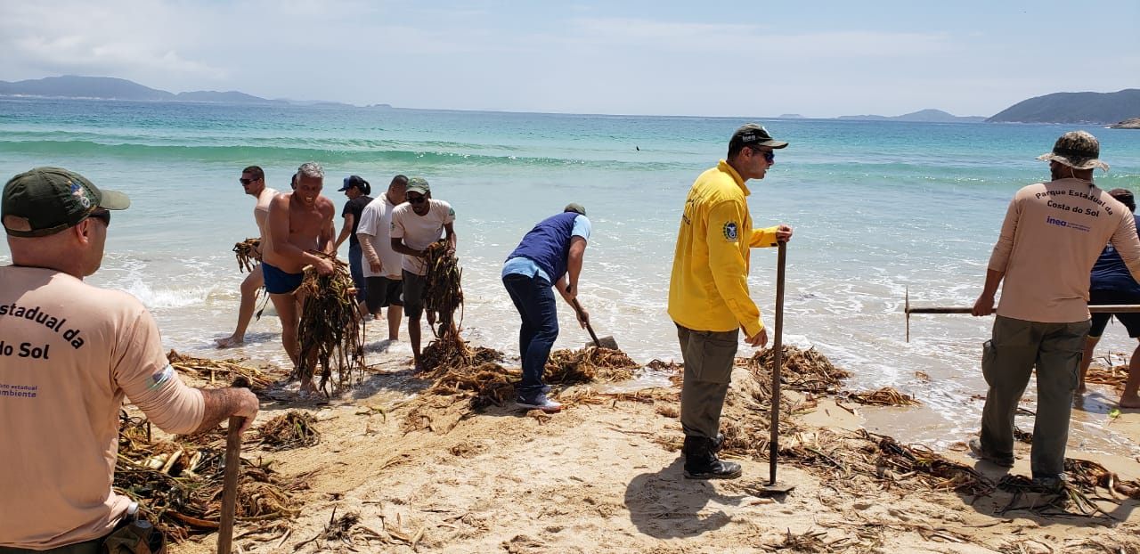 Nesta sexta-feira (20/12), o secretário de Estado do Ambiente e Sustentabilidade, Altineu Côrtes, convocou uma força-tarefa para atuar em um mutirão de limpeza nas praias do Peró e das Conchas, em Cabo Frio, na Região dos Lagos, que estão tomadas por gigogas. Para a ação, foram mobilizadas cerca de 50 pessoas, entre guarda-parques e técnicos da pasta ambiental fluminense e do Instituto Estadual do Ambiente (Inea) que trabalham desde o início da manhã.