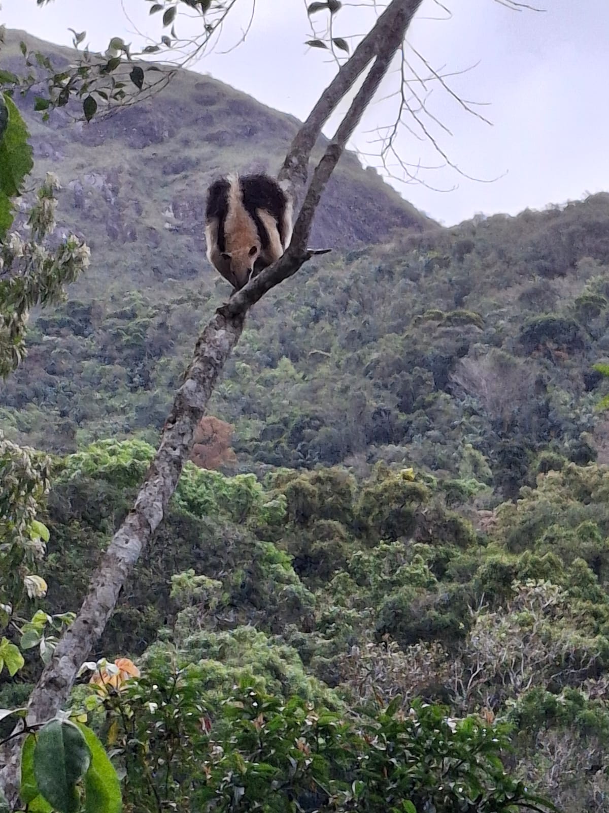 Olha só quem resolveu exibir seu talento para escaladas: um tamanduá-mirim (Tamandua tetradactyla). A espécie foi registrada pelos guarda-parques Aurenio Perrut e Ivan Mota quando faziam, nesta quinta-feira (23/10), o manejo de uma trilha do Parque Estadual do Desengano do Instituto Estadual do Ambiente (Inea), no município de Campos dos Goytacazes.