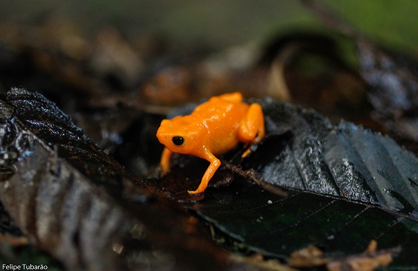 O sapinho pingo-de-ouro (Brachycephalus ephippium) foi registrado pelas lentes fotográficas do guarda-parque do Instituto Estadual do Ambiente (Inea), Felipe Tubarão, em março deste ano, no Maciço da Pedra Branca, onde está situado o Parque Estadual da Pedra Branca, unidade de conservação administrada pelo Inea.