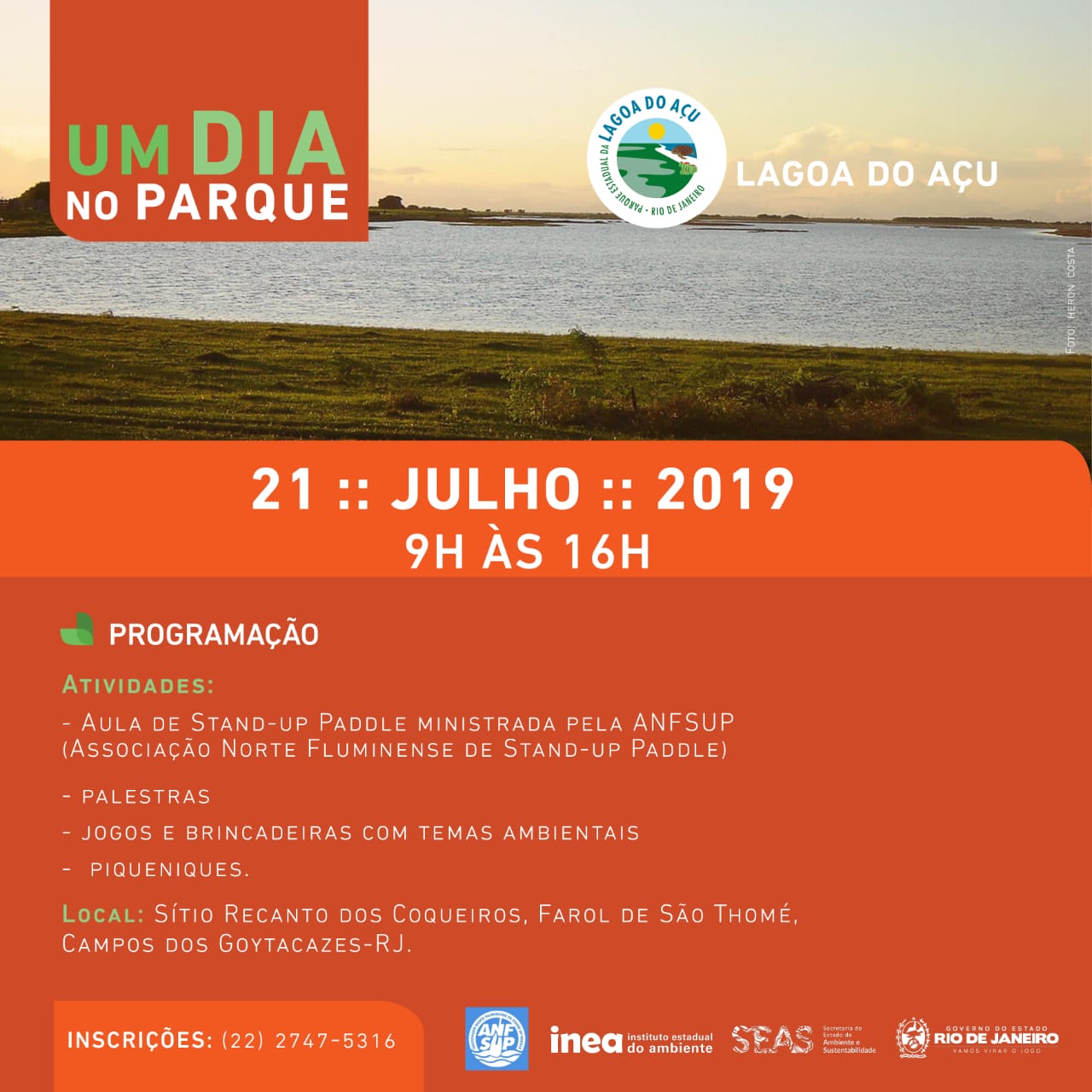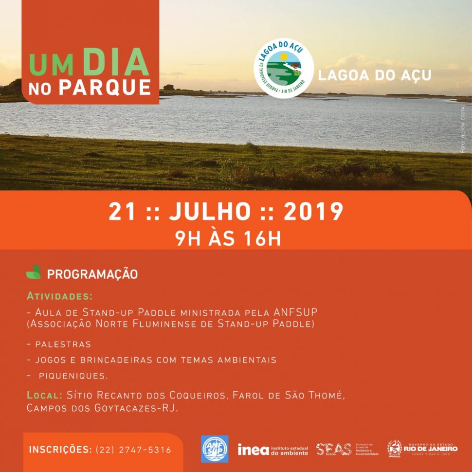 • Parque Estadual da Lagoa do Açu: Palestras com temáticas ambientais, piqueniques, aulas de stand-up paddle e atividades para as crianças. A programação será realizada, das 9h às 16h, no sítio Recanto dos Coqueiros, Farol de São Thomé, em Campos.