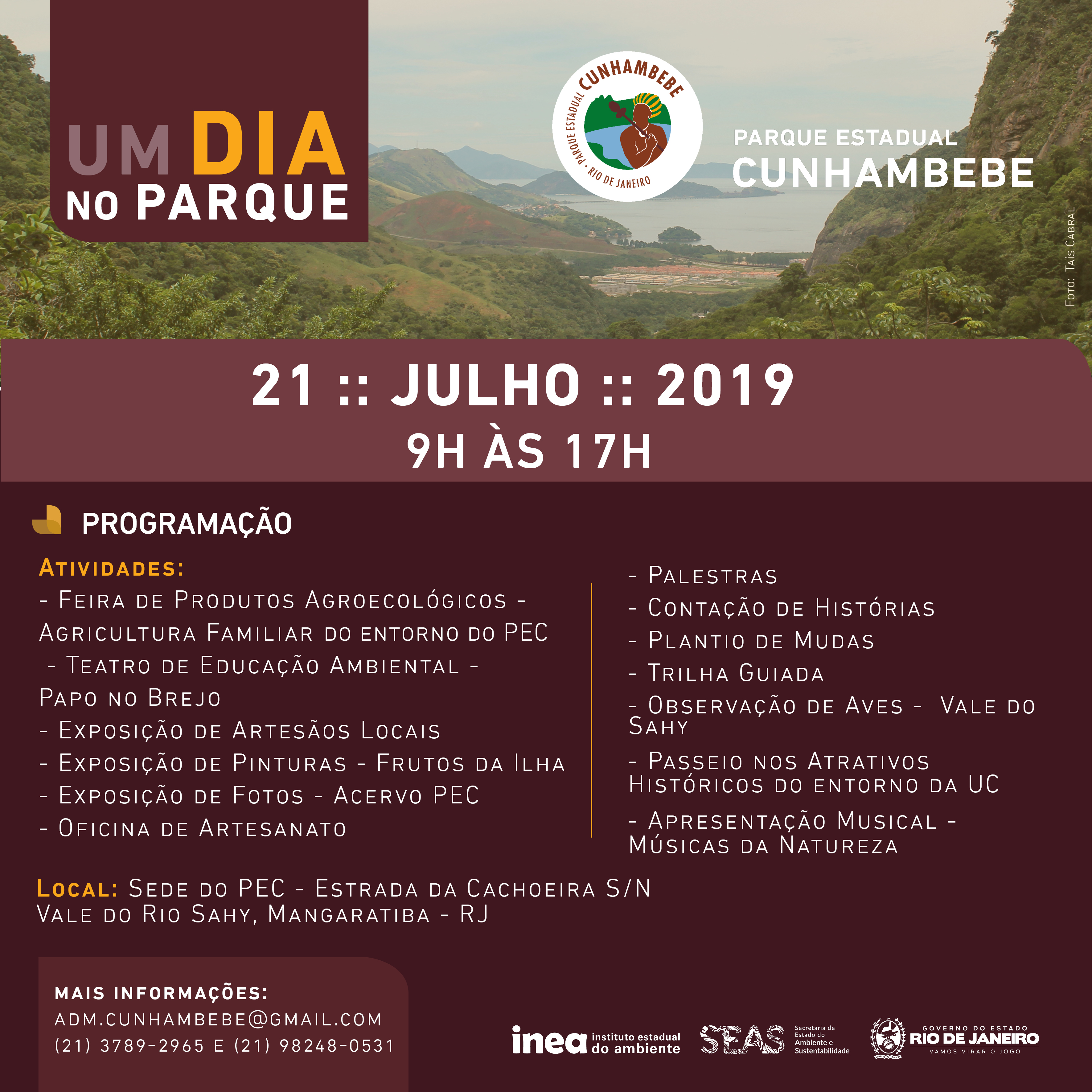 • Parque Estadual Cunhambebe: Feira de produtos agroecológicos, teatro de educação ambiental, oficina de artesanato, plantio de mudas, passeio pelos atrativos históricos situados no entorno da unidade de conservação. As atividades são gratuitas e serão realizadas, das 9h às 17h, na sede do parque, na Estrada da Cachoeira, s/nº, Vale do Rio Sahy, Mangaratiba.