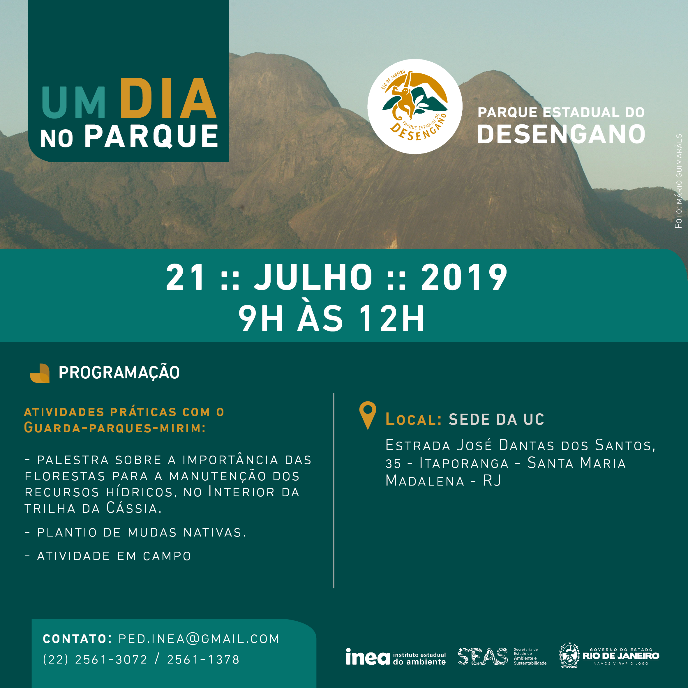 • Parque Estadual do Desengano: Palestras com temáticas ambientais, plantio de mudas e gincanas para crianças e jovens. As atividades contarão com a participação dos guarda-parques mirins. As atividades serão realizadas, das 9h às 12h, na sede da unidade de conservação, na Avenida José Dantas dos Santos, nº 35, Estrada para Horto Florestal Santos Lima, Parque Itaporanga, Santa Maria Madalena.