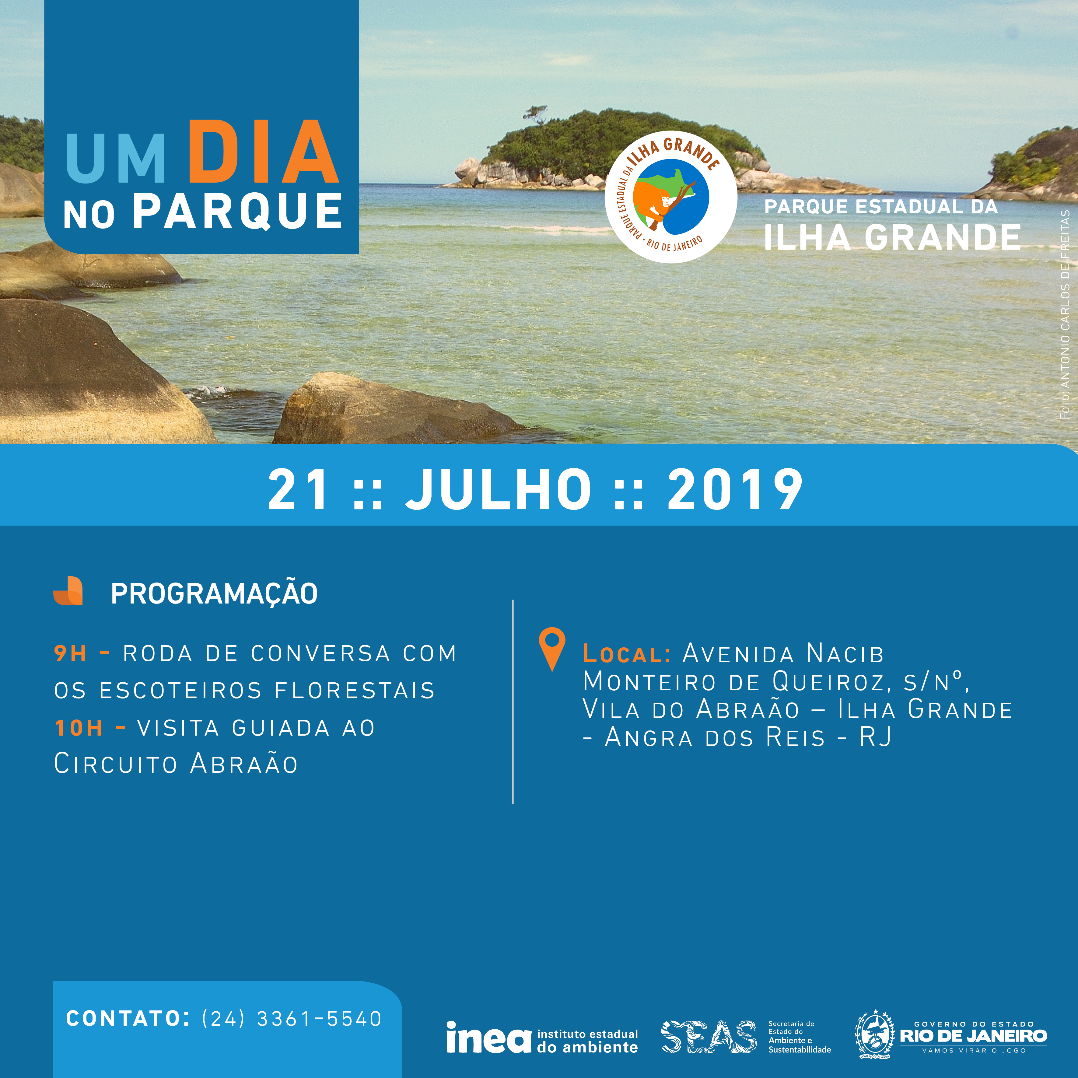 • Parque Estadual de Ilha Grande: Visita guiada ao Circuito Abraão. O ponto de encontro será na Avenida Nacib Monteiro de Queiroz, s/nº, Vila do Abraão, Ilha Grande.