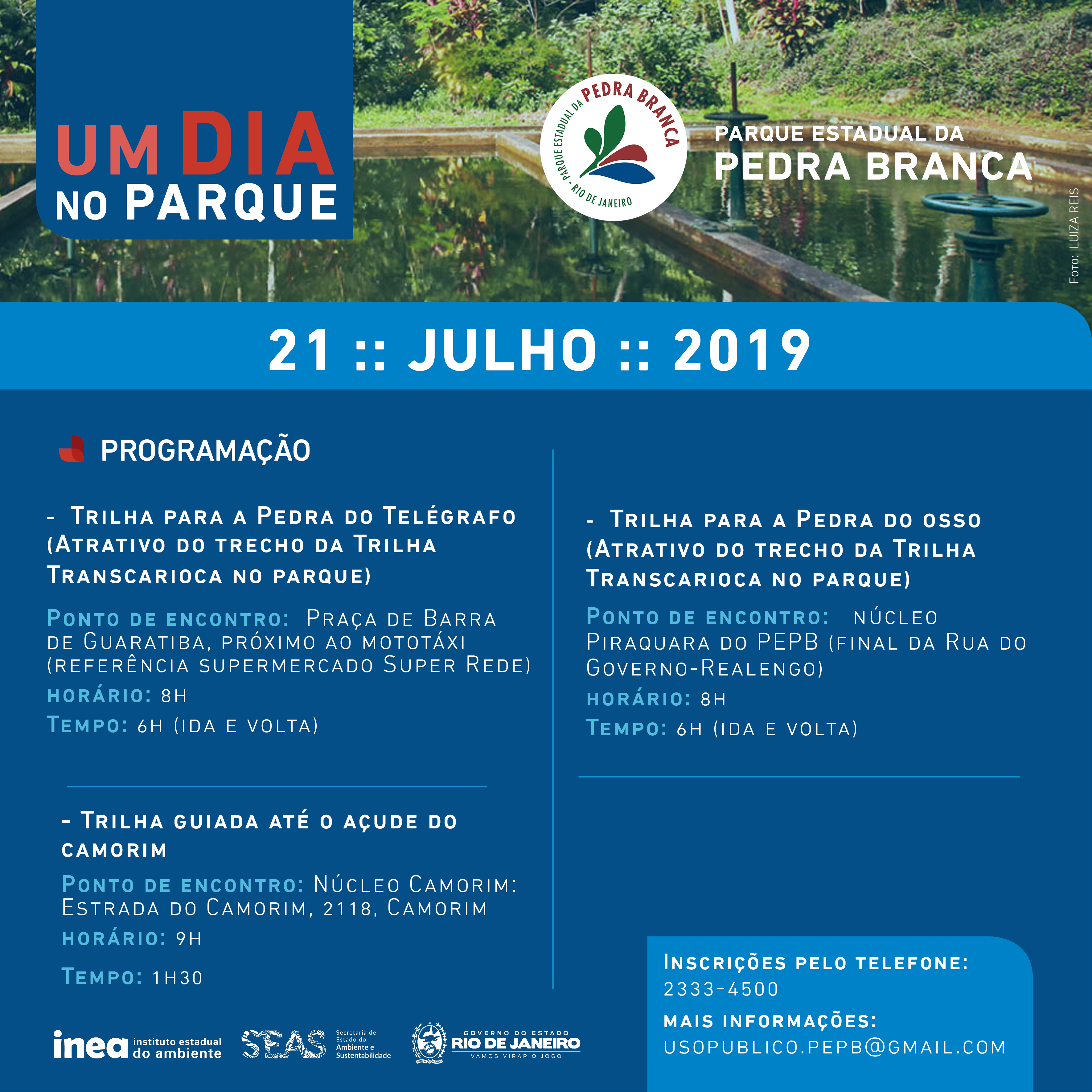 • Área de Proteção Ambiental Estadual do Alto Iguaçu (APA Alto Iguaçu): Caminhada pela trilha interpretativa até a Cachoeira da Ponte e exposição fotográfica da biodiversidade da unidade de conservação. A atividade será realizada na sede da APA, na Avenida Venância, s/nº, Duque de Caxias.