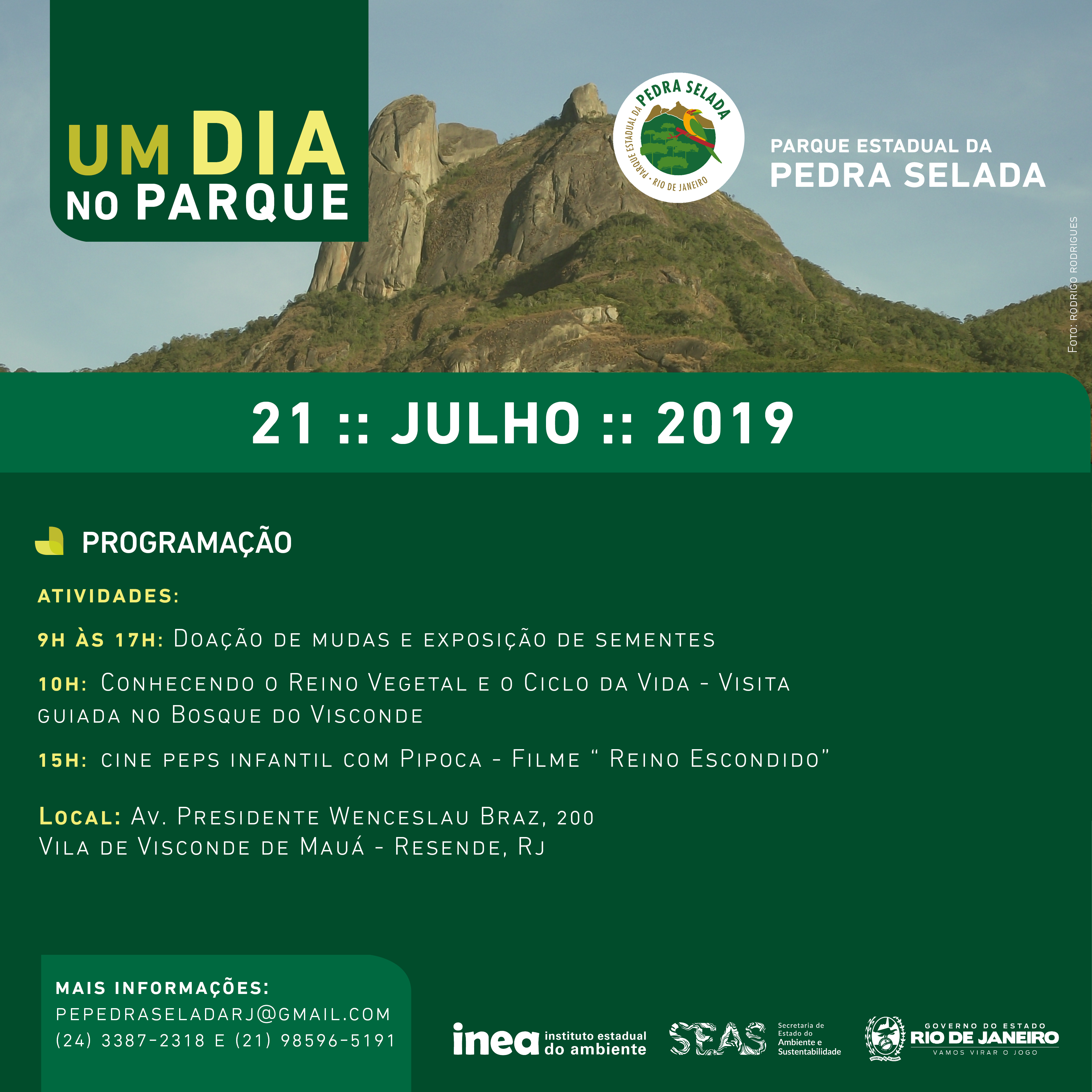 • Parque Estadual da Pedra Selada: Doação de mudas e exposição de sementes, visita guiada ao Bosque do Visconde e exibição do filme “Reino Escondido” para o público mirim. As atividades serão realizadas, das 9h às 17h, na sede da unidade de conservação, na Avenida Presidente Wenceslau Braz, nº 200, Vila de Visconde de Mauá.