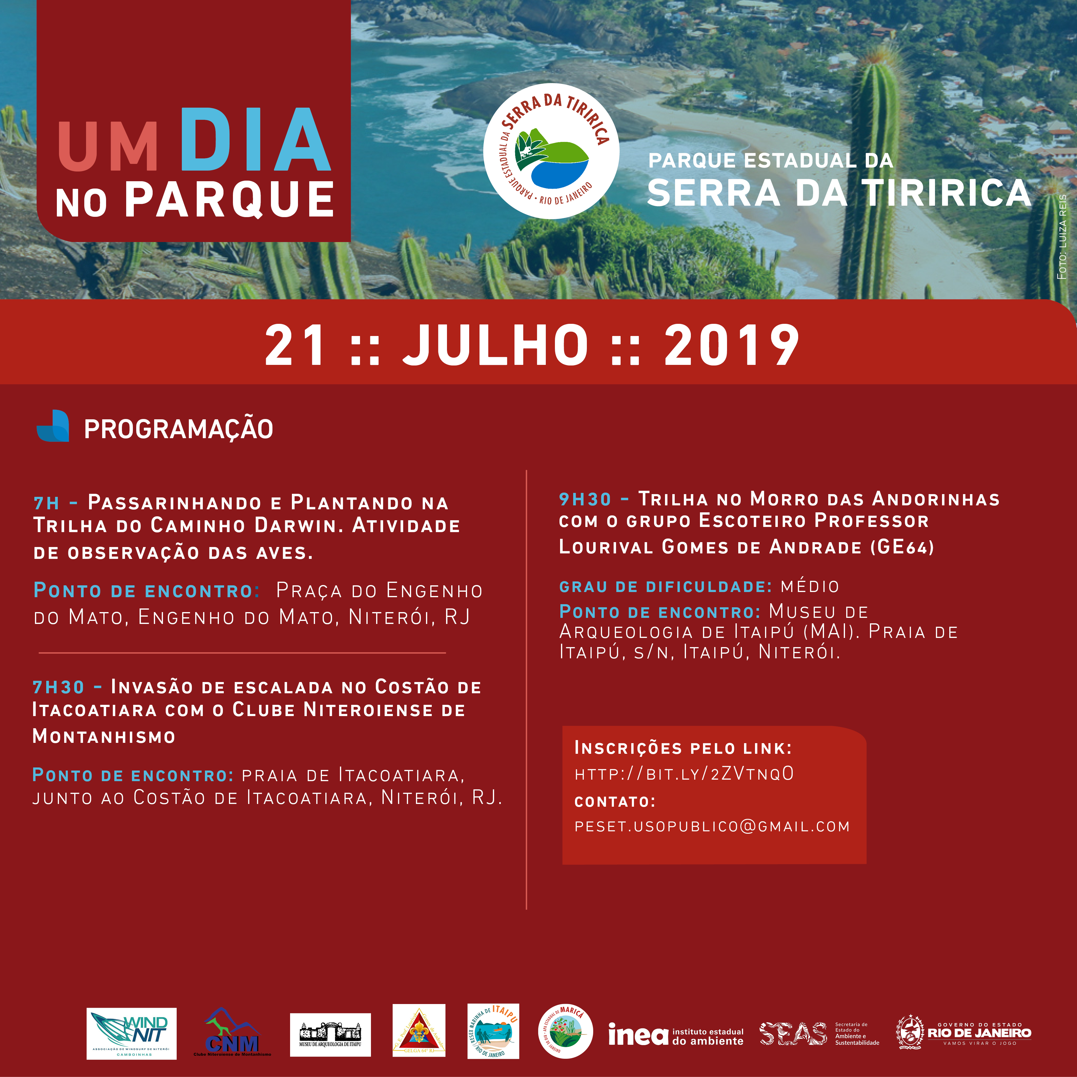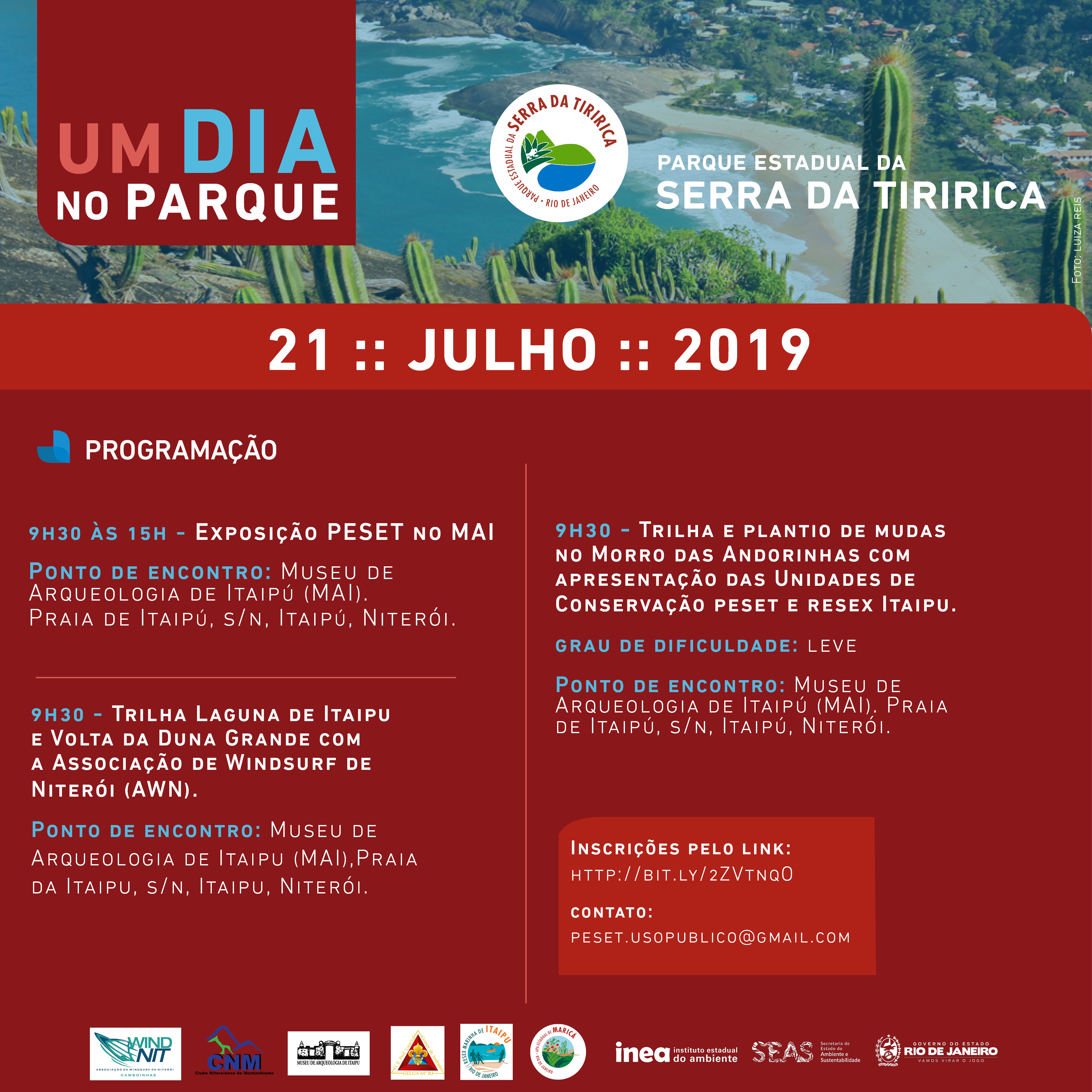 • Parque Estadual da Serra da Tiririca: Caminhada pelas trilhas “Caminho de Darwin” e Morro das Andorinhas; escalada no Costão de Itacoatiara e plantio de mudas no Morro das Andorinhas, que terá apoio da Resex Itaipu. Também haverá uma palestra sobre as atividades da Resex.