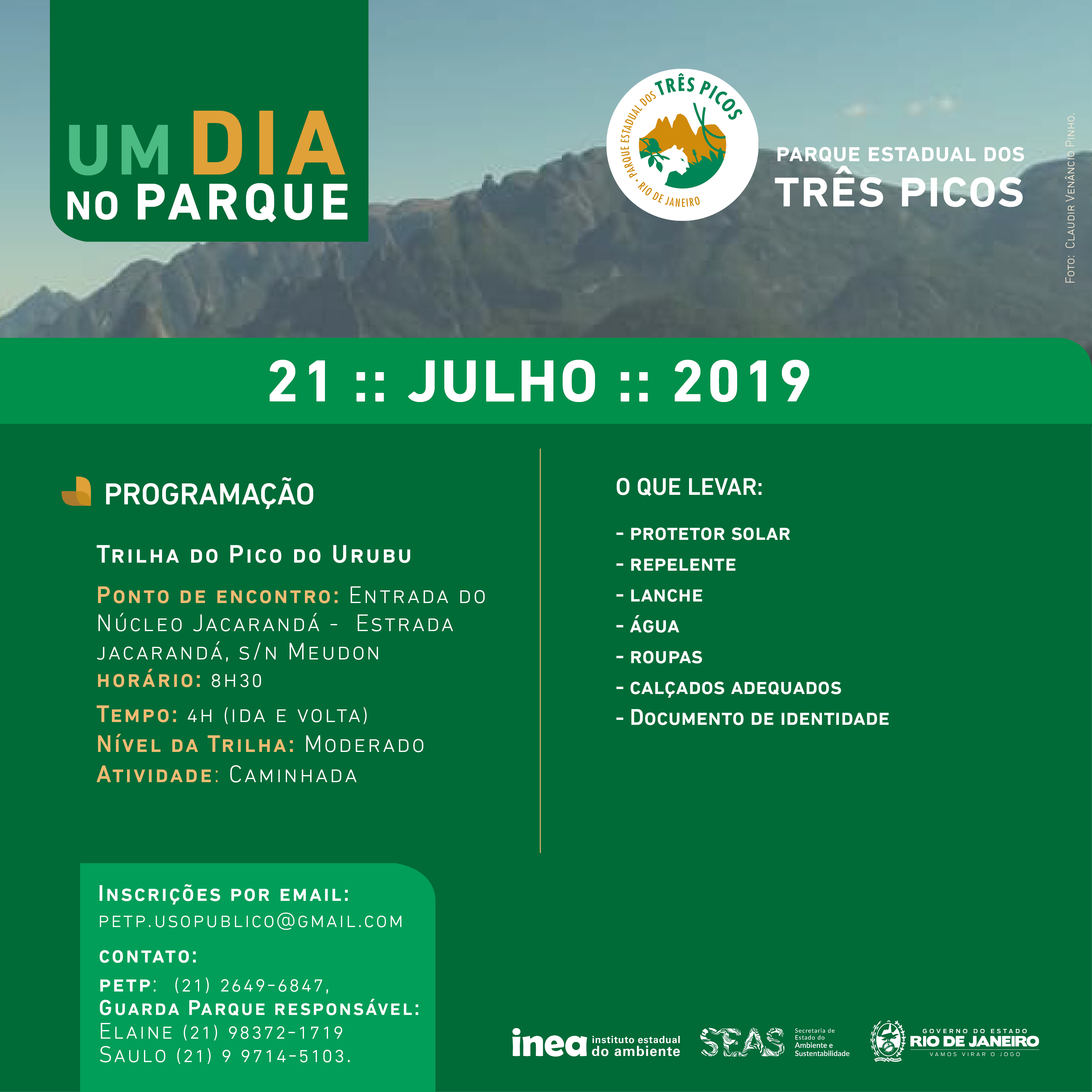 • Parque Estadual dos Três Picos: Caminhada pela trilha do Pico do Urubu. O ponto de encontro será, às 8h30, na entrada do Núcleo Jacarandá, na Estrada do Jacarandá, Nova Friburgo.