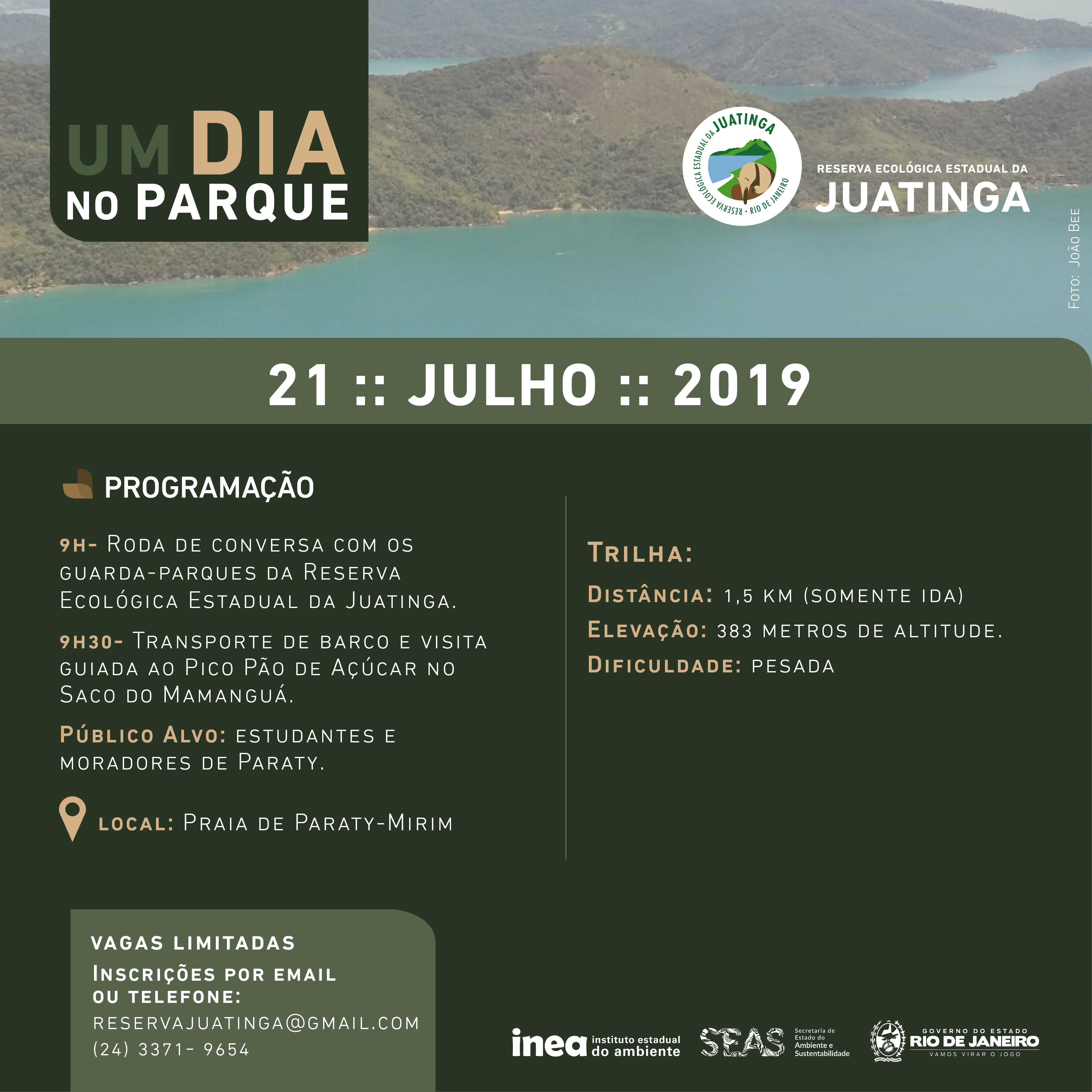• Reserva Biológica Estadual da Juatinga: Palestra com temática ambiental e visita guiada ao Pico Pão de Açúcar, no Saco de Mamanguá. A palestra será às 9h e o ponto de encontro para a caminhada ecológica, às 9h30, será na Praia Paraty-Mirim.